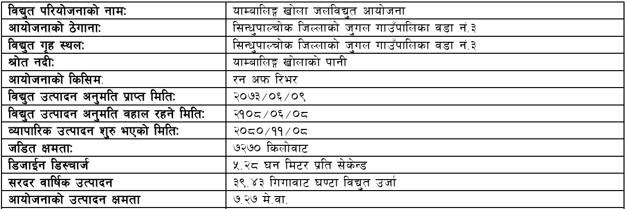 कम्पनीले याम्बालिङ्ग खोलाको पानी उपयोग गरी जुगल गाउँपालिका वडा नं. ३ मा ७.२७ मेगावाटको याम्बालिङ्ग खोला जलविद्युत आयोजना सञ्चालन गरिरहेको छ। उक्त आयोजनाबाट विद्युत उत्पादनका लागि कम्पनीले २०७३ असोज ९ गते अनुमति प्राप्त गरेको थियो कम्पनीले २०८० फागुन ८ गतेदेखि व्यापारिक उत्पादन गरिरहेको छ। कम्पनीको विद्युत उत्पादन अनुमति २५ वर्ष ६ महिना बाँकी रहेको छ।