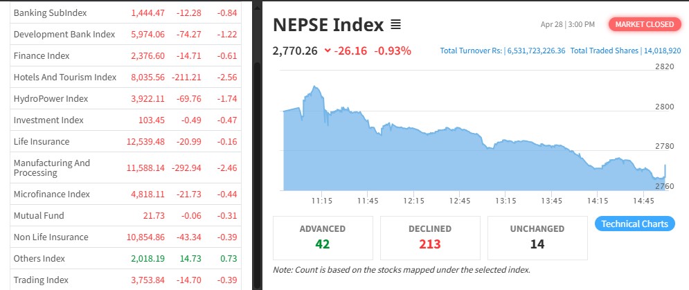 मंगलबार नेप्से परिसूचक २६.१६ अंक घटेर २७७०.२६ विन्दुमा झरेको छ। त्यस्तै, यस दिन सेन्सेटिभ इण्डेक्स २.१४ अंक घटेको छ भने फ्लोट इण्डेक्स १.५३ अंक र सेन्सेटिभ फ्लोट इण्डेक्स ०.८३ अंक घटेको छ।
