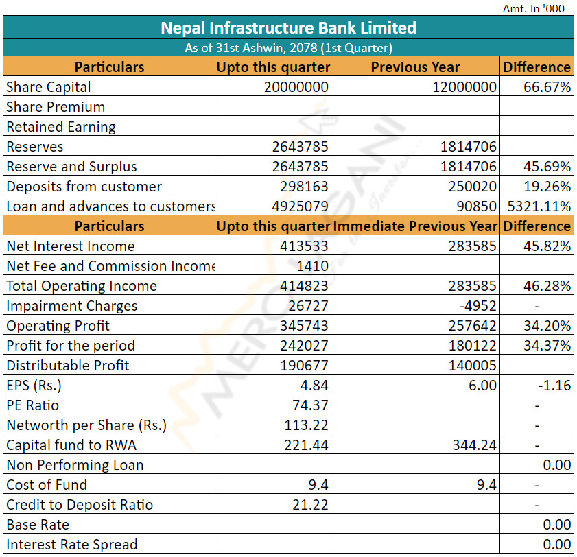 समीक्षा अवधिमा बैंकको चुक्ता पूँजीमा ६६.६७ प्रतिशत बढेको छ भने जगेडा कोष ४५.६९ प्रतिशत बढेको छ। त्यसैगरी, बैंकको निक्षेप १९.२६ प्रतिशत र कर्जा उल्लेख्य बढेको छ।