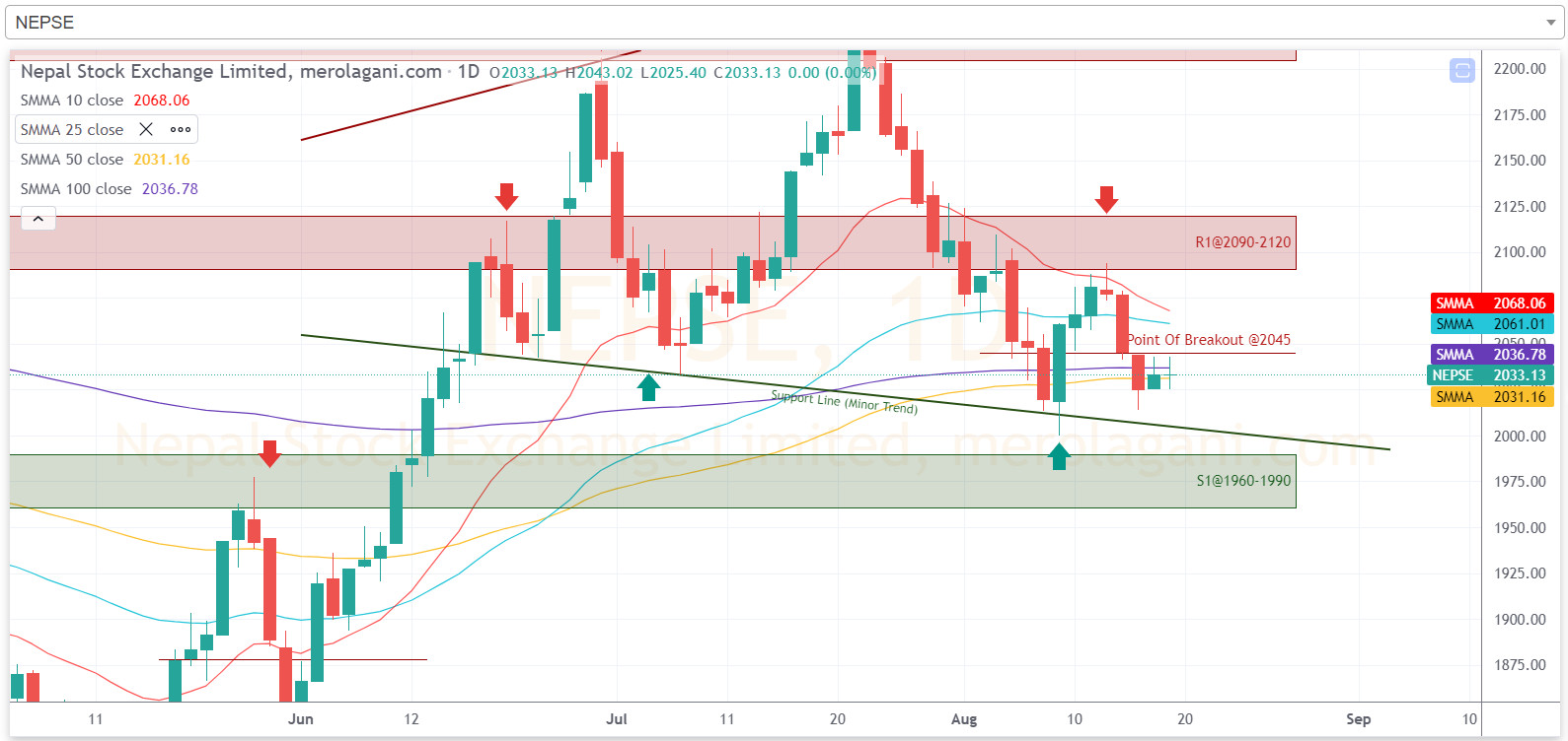 अहिले बजार ‘पर्ख र हेर’ को अवस्थामा रहेको छ। यस साता नेप्से परिसूचक उकालो लागेमा २०९० देखि २१२० को क्षेत्रमा प्रतिरोधको सामना गर्ने देखिन्छ। यद्यपि, उकालो लाग्नका लागि २०४५ को ब्रेकआउट विन्दु पार गर्नु पर्नेछ। त्यसैगरी, यस साता नेप्से ओरालो लागेमा भने १९६० देखि १९९० को क्षेत्रमा टेवा पाउने देखिन्छ।