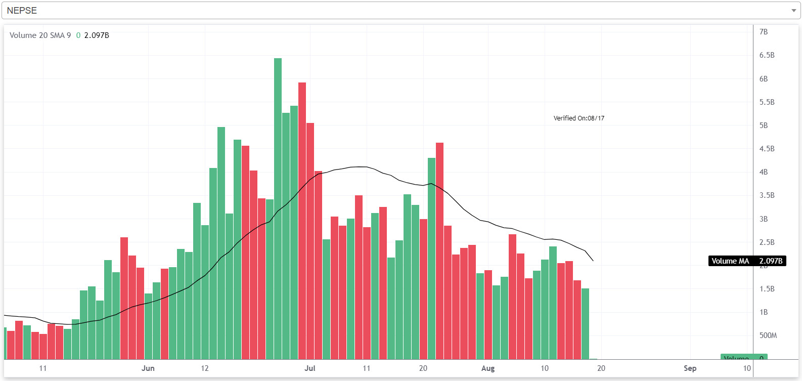 नेप्सेसँगै गत साता भोल्यूम पनि कमजोर देखिएको छ। गत साता नेप्सेमा दैनिक औषतमा १ अर्ब ७४ करोडको शेयर खरिदबिक्री भएको छ। साताको अन्तिम कारोबार दिन नेप्सेको २० दिने औषत भोल्यूम २ अर्ब ९ करोड रहेको छ। २० दिने औषत भोल्यूमको तुलनामा दैनिक औषत भोल्यूम १७३ प्रतिशत कम हो।