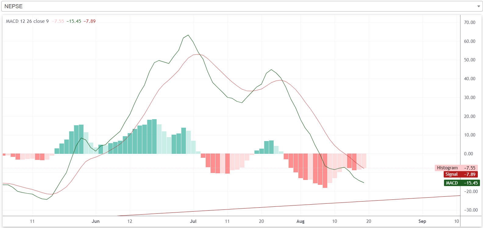 गत साता नेप्सेको एमएसिडी रेखा, सिग्नल रेखा र हिस्टोग्राम सबै शून्य रेखाभन्दा तल रहेको छ। त्यसैगरी, नेप्सेको एमएसिडी रेखा सिग्नल रेखाभन्दा पनि तल रहेको छ। यसले नेप्से बियरिश प्रवृत्तिमा रहेको संकेत गर्दछ।