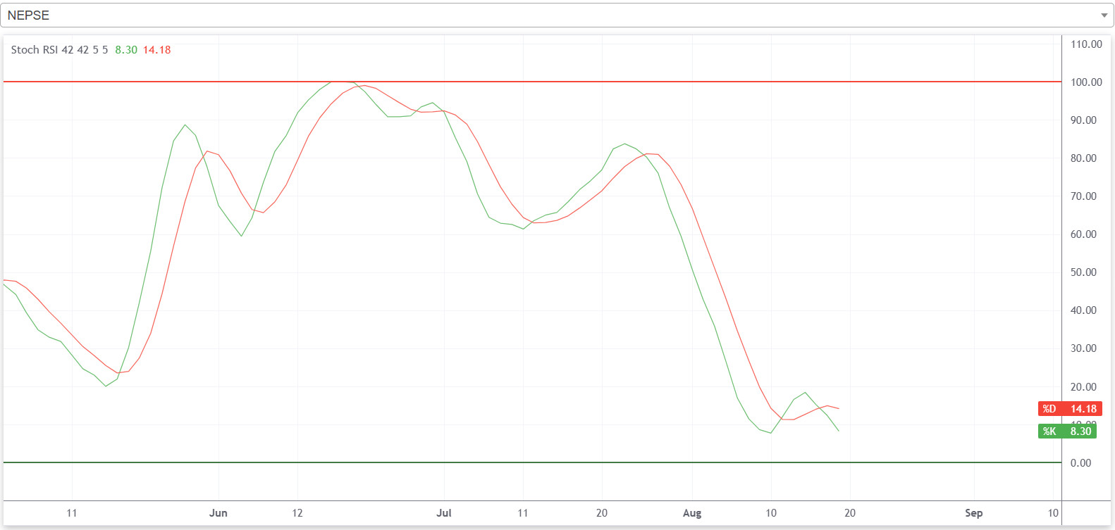 गत साता नेप्सेको स्टकास्टिक आरएसआई ओभरसोल्ड जोनमा रहेको छ। यसले बजारमा शेयर खरिदचापको तुलनामा बिक्रीचाप बढी रहेको संकेत गर्दछ।