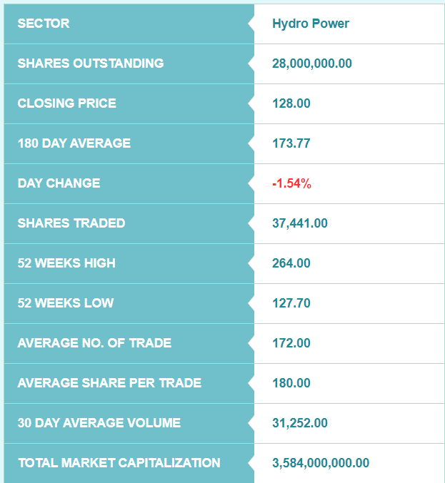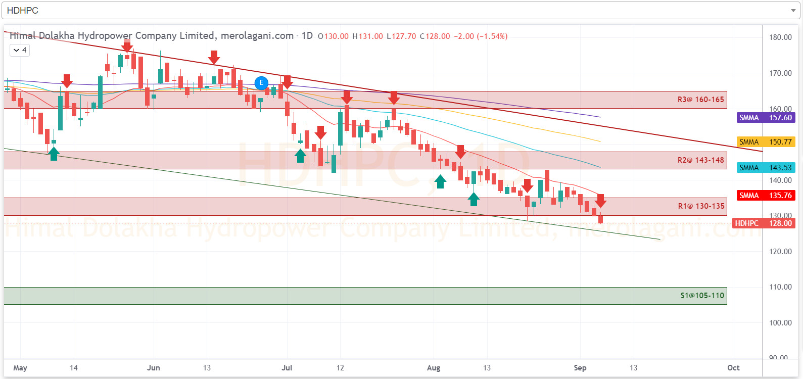 साताको अन्तिम कारोबार दिन कम्पनीको शेयरमूल्यले ५२ हप्ताको न्यूनतम मूल्य बनाएको छ। यस साताको अन्तिम कारोबार दिन कम्पनीको शेयरमूल्य १२७ रुपैयाँ ७० पैसासम्म कारोबार भएको थियो। सो नै कम्पनीको पछिल्लो ५२ हप्ताको न्यून मूल्य रहेको छ। आगामी साता कम्पनीको शेयरमूल्य ओरालो लागेमा १०५ देखि ११० को क्षेत्रमा टेवा पाउने देखिन्छ। त्यस्तै उकालो लागेमा भने १३० देखि १३५ को क्षेत्रमा प्रतिरोधको सामना गर्ने देखिन्छ।