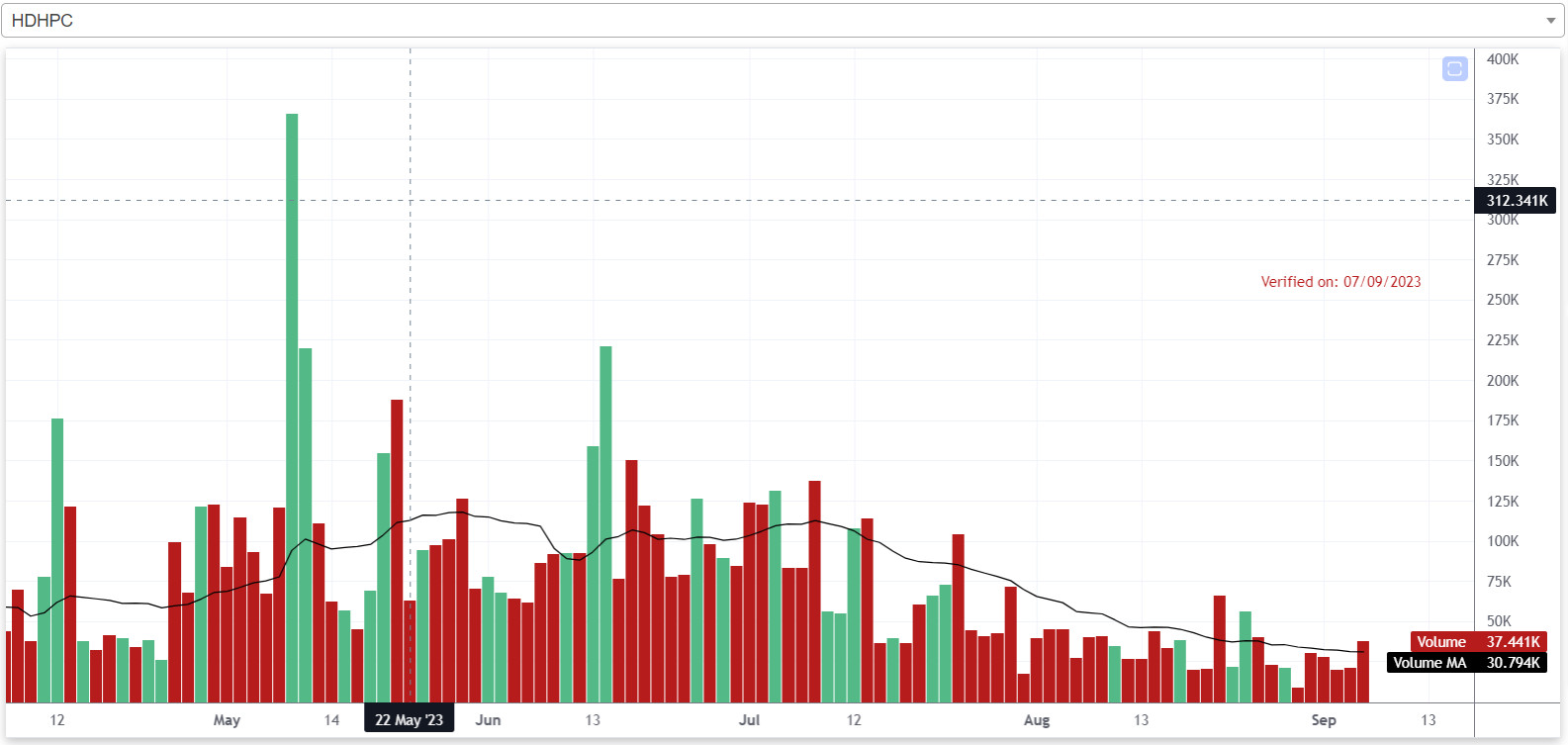 कम्पनीको शेयरमूल्यसँगै यस साता भोल्यूम पनि घटेको छ। यस साता कम्पनीको दैनिक औषतमा २६ हजार ५३५ कित्ता शेयर खरिदबिक्री भएको छ। साताको अन्तिम कारोबार दिन कम्पनीको २० दिने औषत भोल्यूम ३० हजार ७९४ कित्ता रहेको छ। २० दिने औषत भोल्युमको तुलनामा दैनिक औषत भोल्यूमको तुलनामा १३.८३ प्रतिशत कम हो।