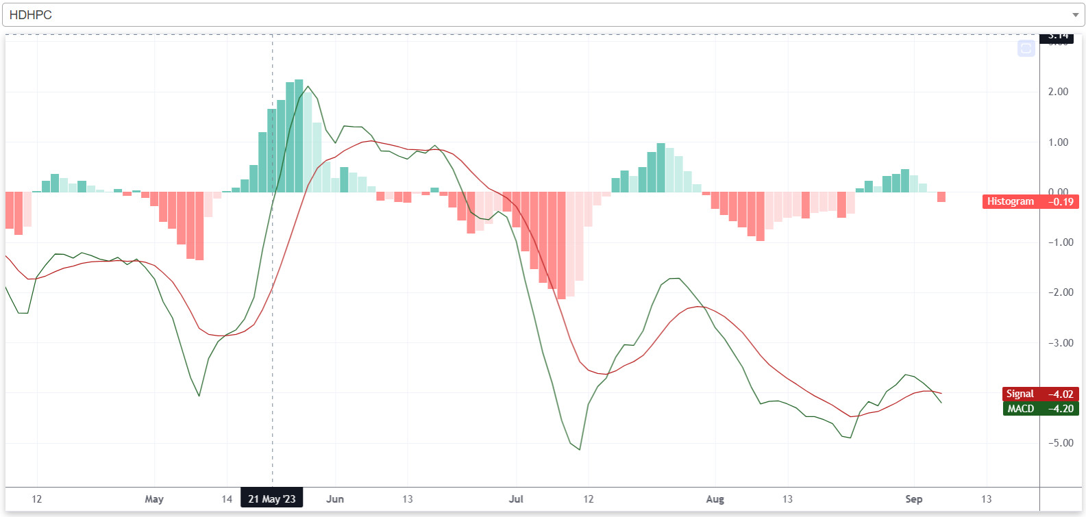 प्राविधिक विश्लेषणको उपकरण एमएसिडीमा यस साता कम्पनीको शेयरमूल्यले बियरिश क्रशओभर बनाएको छ। एमएसिडी रेखाले सिग्नल रेखालाई माथिबाट काटेर तल लागेसँगै यस्तो क्रशओभर बनेको हो। यसले आगामी दिनमा कम्पनीको शेयरमूल्य घट्ने संकेत गर्दछ।