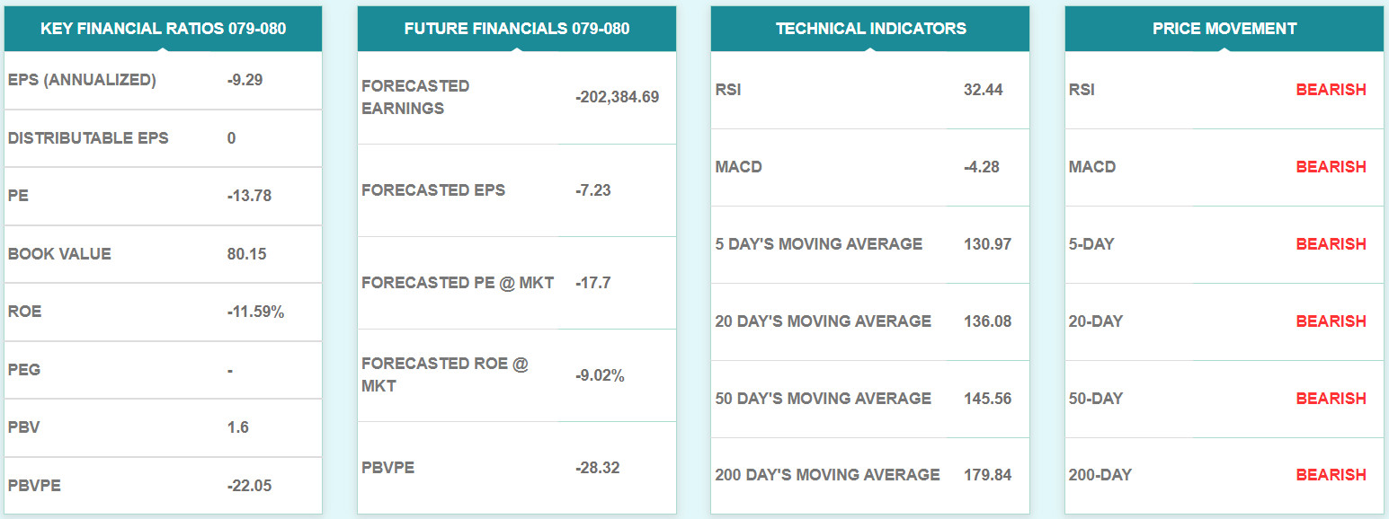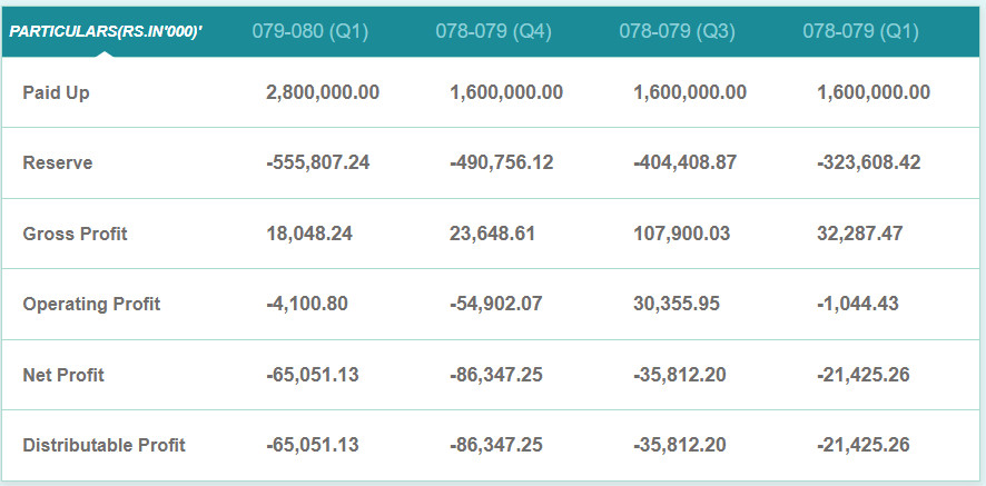 सो अवधिसम्ममा कम्पनीको प्रतिशेयर आम्दानी ९ रुपैयाँ २९ पैसा ऋणात्मक रहेको छ। कम्पनीको बुकभ्यालु ८० रुपैयाँ १५ पैसा रहेको छ भने प्राइस टु बुकभ्यालु रेशियो १.६ गुणा रहेको छ।