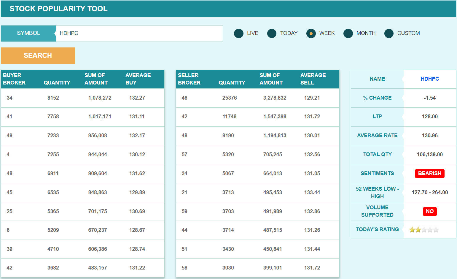 यस साता ब्रोकर नम्बर ३४ ले कम्पनीको सर्वाधिक ८ हजार १५२ कित्ता शेयर खरिद गरेको छ। त्यस्तै, ब्रोकर नम्बर ४१, ४९ र ४ ले कम्पनीको ७ हजारभन्दा बढी कित्ता शेयर खरिद गरेको छ। सर्वाधिक बिक्री गर्ने ब्रोकर भने ४६ रहेको छ। सो ब्रोकरले यस साता कम्पनीको २५ हजार कित्ता भन्दा बढी शेयर बिक्री गरको छ।