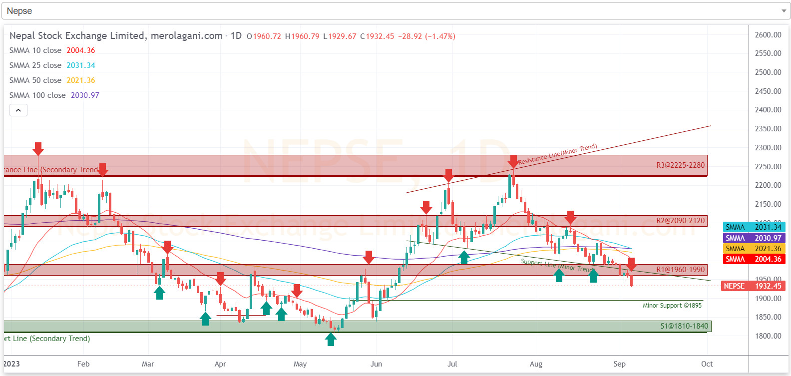 गत साता नेप्से परिसूचक १९६० देखि १९९० को प्रतिरोध क्षेत्र नजिक बन्द भएको छ। अघिल्लो साताको टेवा क्षेत्रलाई तोडेर गत साता नेप्से परिसूचक ओरालो लागेसँगै सो क्षेत्र यस साताको लागि प्रतिरोध क्षेत्र बनेको हो। यस साता नेप्से परिसूचक ओरालो लागेमा १८१० देखि १८४० को क्षेत्रमा टेवा पाउने देखिन्छ। त्यस्तै, १८९५ मा पनि नेप्सेले सानो सपोर्ट पाउने देखिन्छ।