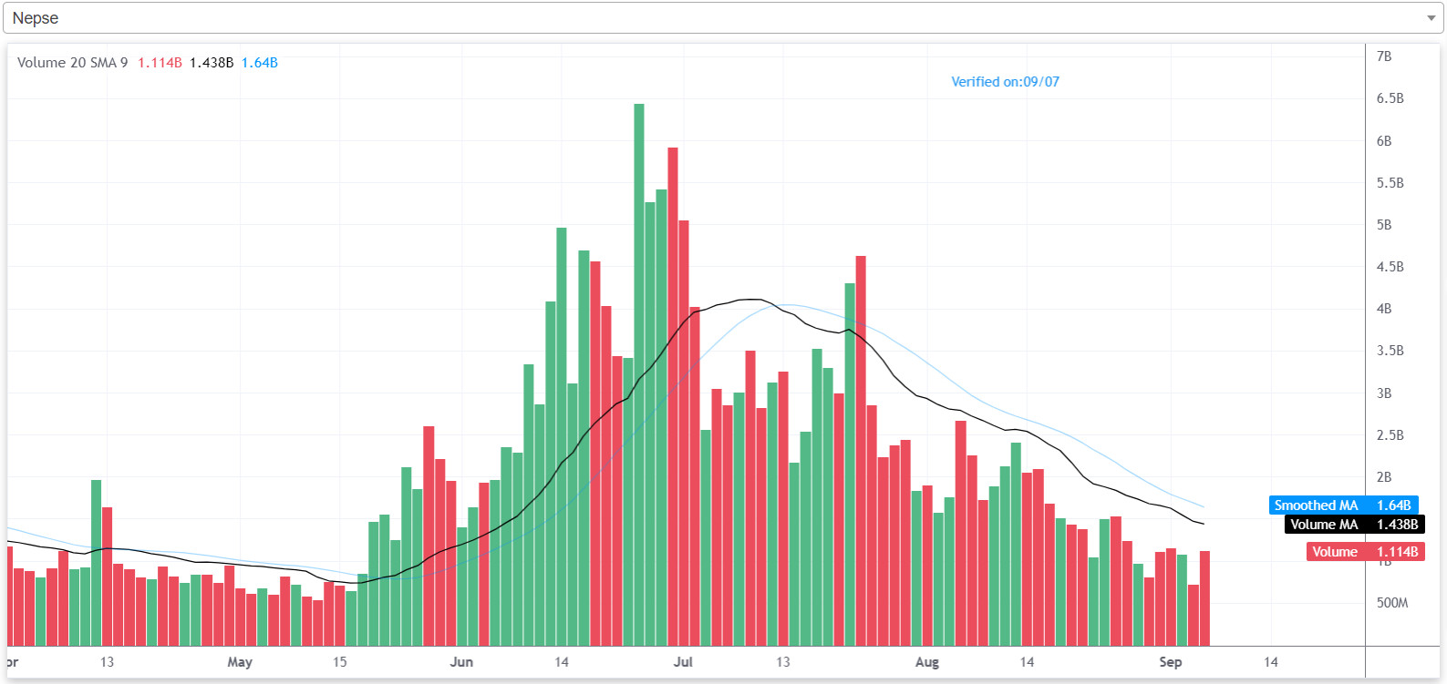 नेप्से घटेसँगै गत साता भोल्यूम पनि कमजोर रहेको छ। गत साता नेप्सेमा दैनिक औषतमा १ अर्ब ६ करोडको शेयर खरिदबिक्री भएको थियो। साताको अन्तिम कारोबार दिन नेप्सेको २० दिने औषत भोल्यूम १ अर्ब ४३ करोड रहेको छ। २० दिने औषत भोल्यूमको तुलनामा गत साताको दैनिक औषत भोल्यूम २५.८७ प्रतिशत कम हो।
