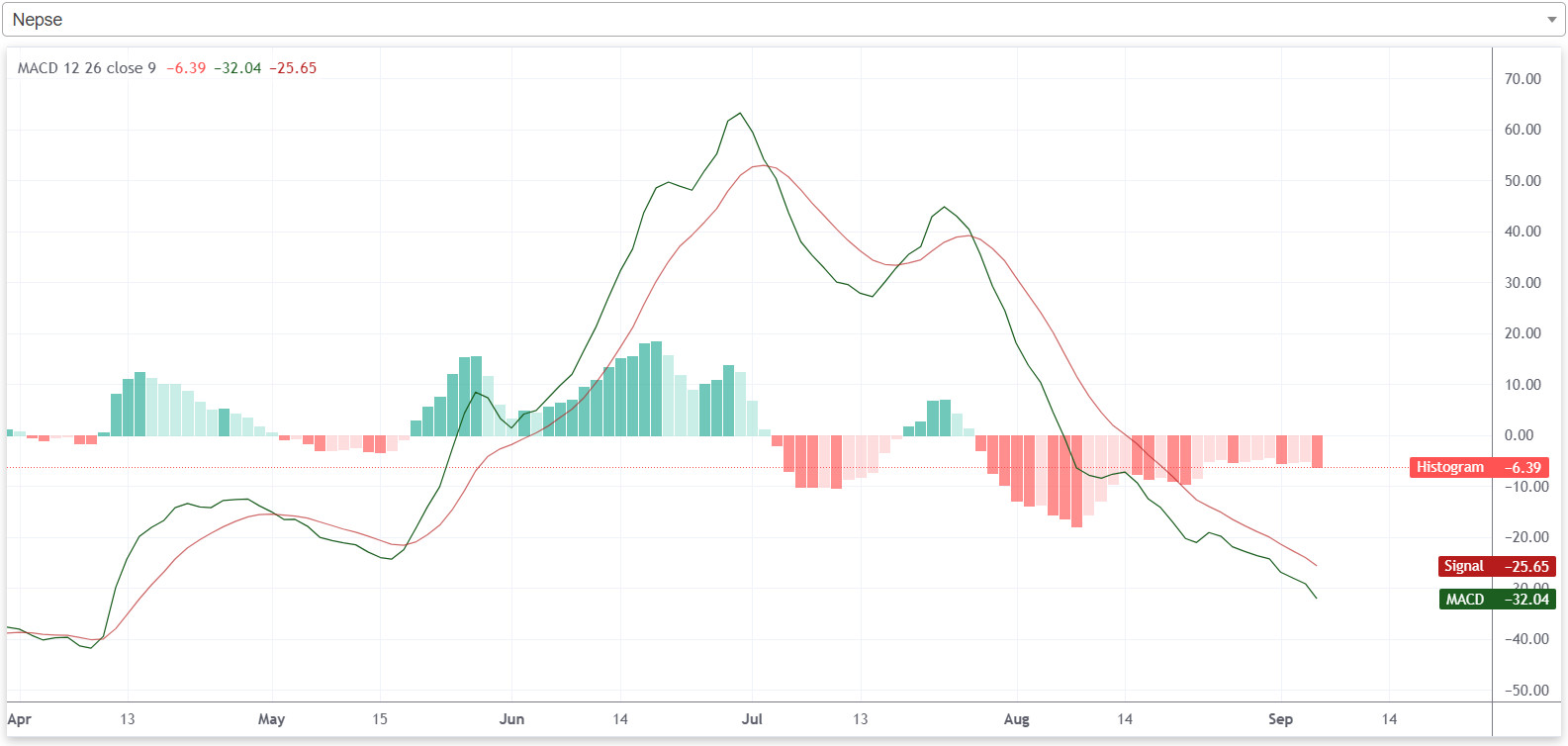 गत साता नेप्सेको एमएसिडी रेखा, सिग्नल रेखा र हिस्टोग्राम सबै नकारात्मक क्षेत्र अर्थात शून्य रेखाभन्दा तल रहेको छ। त्यस्तै, नेप्सेको एमएसिडी रेखा, सिग्नल रेखाभन्दा तल रहेको छ। यसले हाल नेप्से बियरिश प्रवृत्तिमा रहेको संकेत गर्दछ।