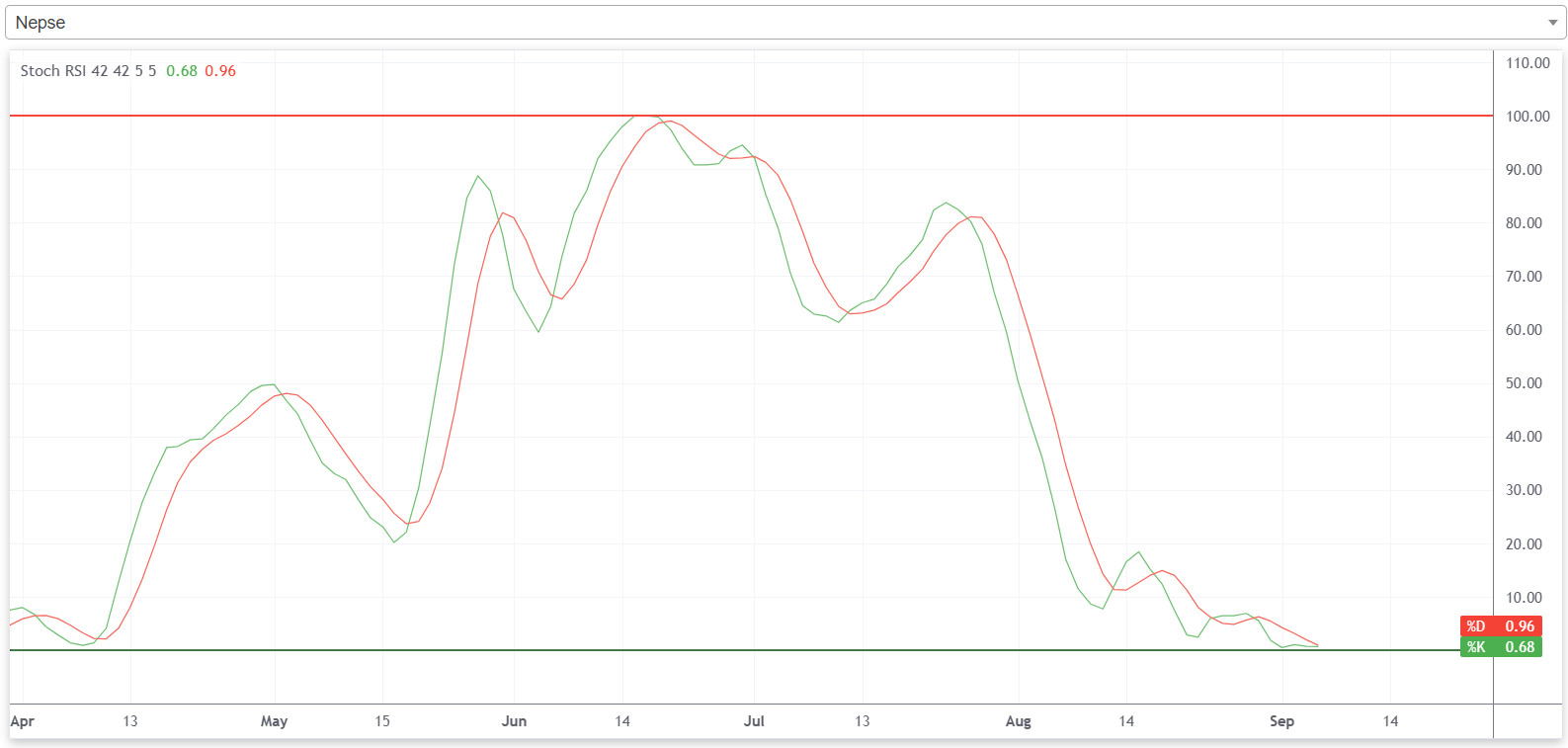 गत साता नेप्सेको स्टकास्टिक आरएसआई ओभरसोल्ड जोनमा रहेको छ। यसले बजारमा खरिदचापको तुलनामा बिक्री चाप बढी रहेको संकेत गर्दछ।