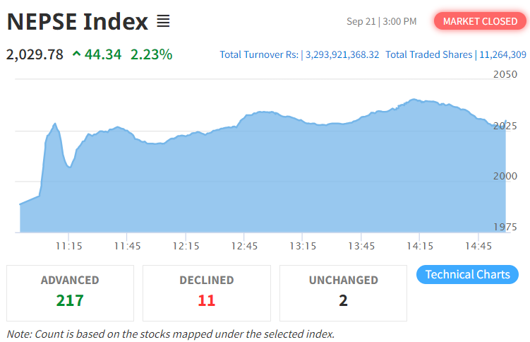 यस दिन नेप्से परिसूचक ४४.३४ अंक बढेर २०२९.७८ विन्दुमा पुगेको छ। त्यसैगरी, यस दिन सेन्सेटिभ इण्डेक्स ७.५५ अंक बढेको छ भने फ्लोट इण्डेक्स २.९७ अंक र सेन्सेटिभ फ्लोट इण्डेक्स २.२७ अंक बढेको छ।