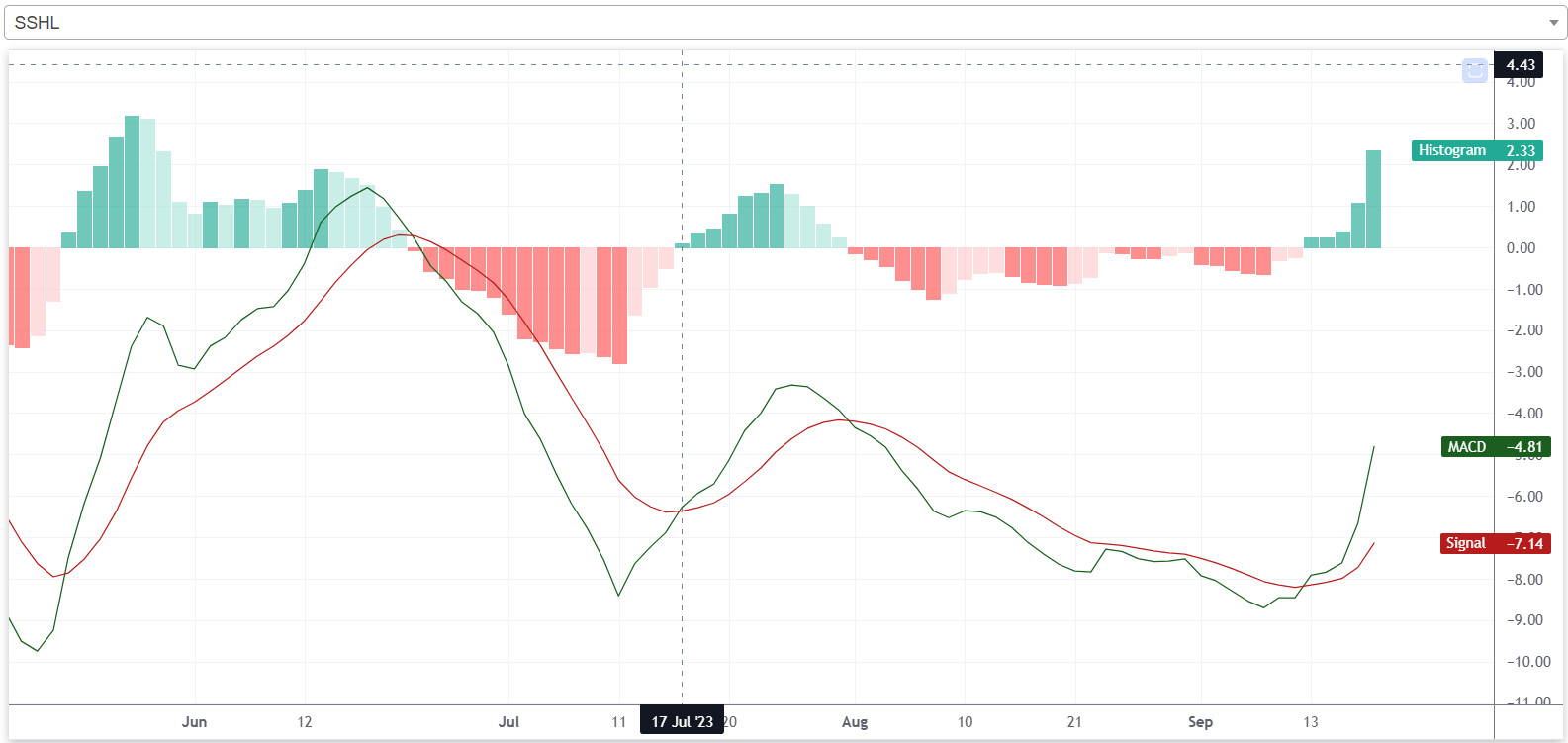 प्राविधिक विश्लेषणको उपकरण एमएसिडीमा कम्पनीको शेयरमूल्य बुलिश प्रवृत्तिमा देखिएको छ। यस साता कम्पनीको एमएसिडी रेखा, सिग्नल रेखाभन्दा माथि रहेको छ। गत साता कम्पनीको शेयरमूल्यले बुलिश क्रशओभर बनाएको थियो, जसपश्चात कम्पनीको शेयरमूल्यमा बुलिश प्रवृत्ति देखिएको हो। यस साता कम्पनीको हिस्टोग्राम पनि सकारात्मक क्षेत्रमा रहेको छ।