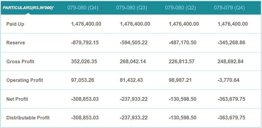 गत आर्थिक वर्षको असार मसान्तसम्ममा कम्पनीले ३० करोड ८८ लाख रुपैयाँ खुद नोक्सानी व्यहोरेको छ। अघिल्लो आर्थिक वर्षको सोही अवधिसम्ममा कम्पनीको नोक्सानी ३६ करोड ३६ लाख रुपैयाँ थियो। सो अवधिसम्ममा कम्पनीको वित्तीय खर्च ४० करोड ५९ लाख रुपैयाँ रहेको छ।