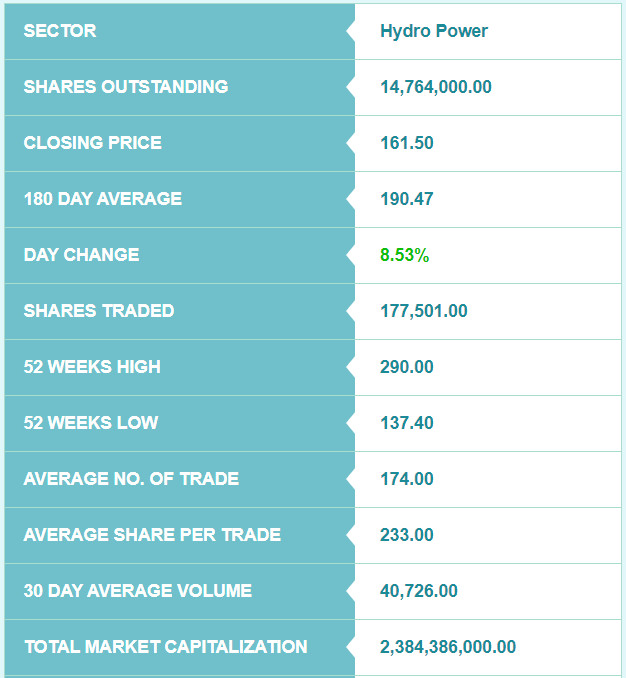 कम्पनीको पछिल्लो ५२ हप्ताको उच्च मूल्य २९० रुपैयाँ रहेको छ भने न्यून मूल्य १३७ रुपैयाँ ४० पैसा रहेको छ। कम्पनीको १८० दिने औषत मूल्य १९० रुपैयाँ ४७ पैसा रहेको छ।