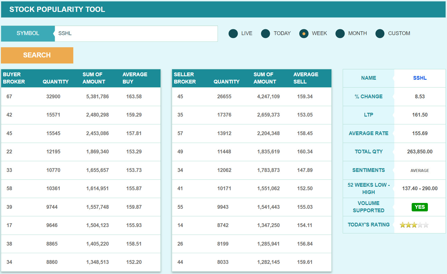 यस साता ब्रोकर नम्बर ६७ ले कम्पनीको सबैभन्दा बढी शेयर खरिद गरेको छ भने सर्वाधिक बिक्री गर्नेमा ब्रोकर नम्बर ४५ रहेको छ। ६७ ले यस साता ३२ हजार ९०० कित्ता शेयर खरिद गरेको छ। त्यस्तै, ब्रोकर नम्बर ४२ र ४५ ले साढे १५ हजार कित्ता शेयर खरिद गरेको छ। ब्रोकर नम्बर ४५ ले भने यस साता कम्पनीको २६ हजार ६५५ कित्ता शेयर बिक्री गरेको छ।