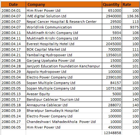 गत साउन ७ गते कम्पनीको १३ हजार तीन सय ९२ कित्ता शेयर ओभर द काउन्टर(ओटिसि)मा कारोबार भए। त्यस यता भने कम्पनीको शेयर कारोबार भएको छैन।
