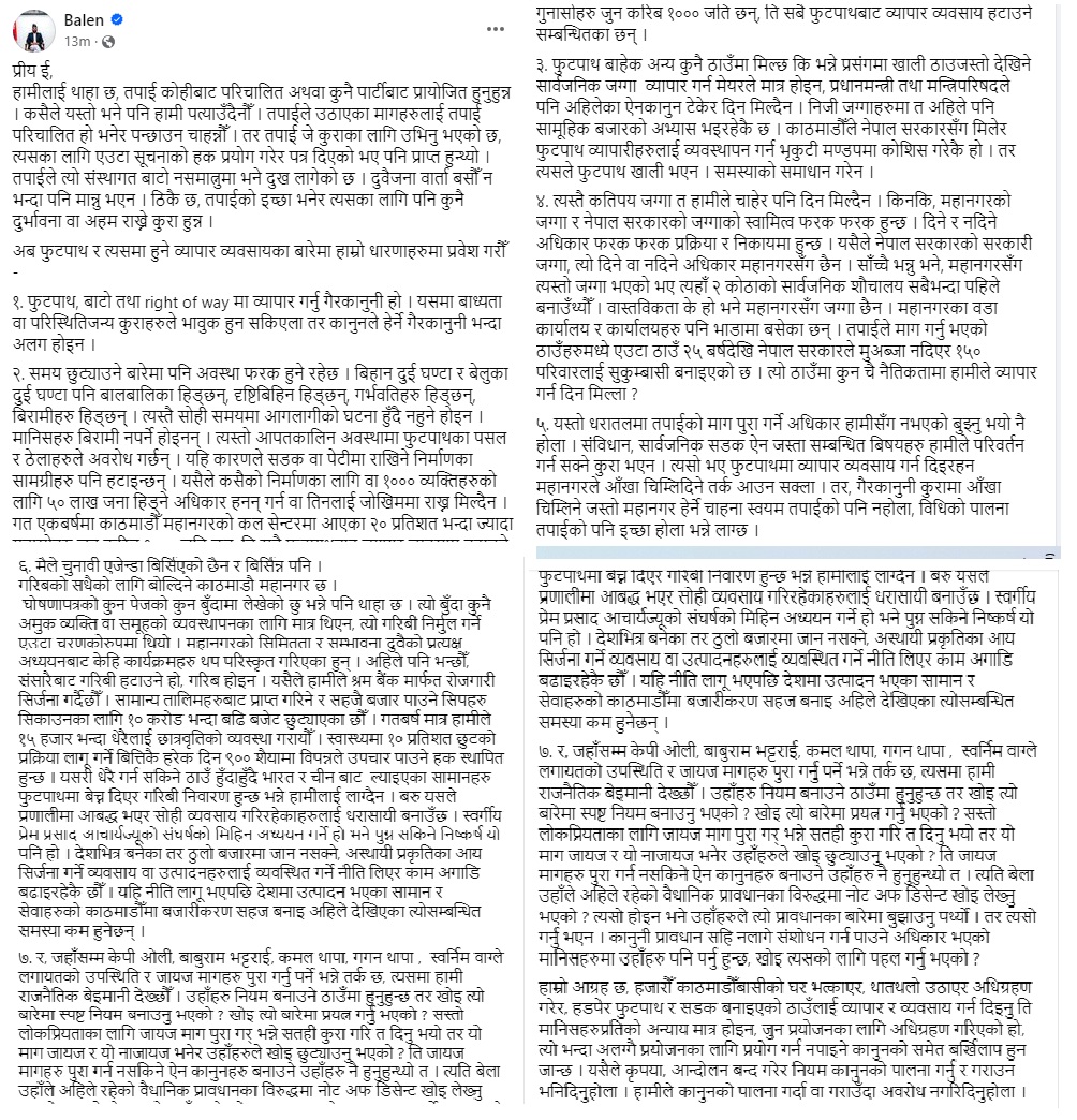 बुधबार समाजिक सञ्चाल मार्फत सम्बोधन गर्दै ७ बुँदे धारणा सार्वजनिक गरेका हुन । बालेन चुनावी बाचा सम्झाउँदै राष्ट्रिय सभागृहबाहिर अभियन्ता ई ९ दिनदेखि उभिएर प्रदर्शन गरिरहेका छन्।