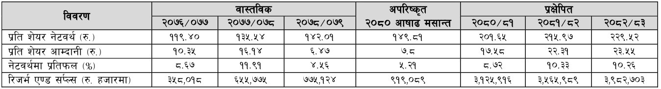 त्यसैगरी, कम्पनीले चालु आर्थिक वर्षको अन्त्यसम्ममा ३ बर्अ १२ करोड ५९ लाख रुपैयाँ सञ्चित मुनाफा आर्जन गर्ने प्रक्षेपण गरेको छ। भने प्रतिशेयर आम्दानी १७ रुपैयाँ ५८ पैसा पुग्ने प्रक्षेपण गरेको छ। गत आर्थिक वर्षमा ५.२१ प्रतिशत रहेको कम्पनीको नेटवर्थमा प्रतिफल चालु आर्थिक वर्षको ८.७२ प्रतिशत पुग्ने प्रक्षेपण कम्पनीको रहेको छ।