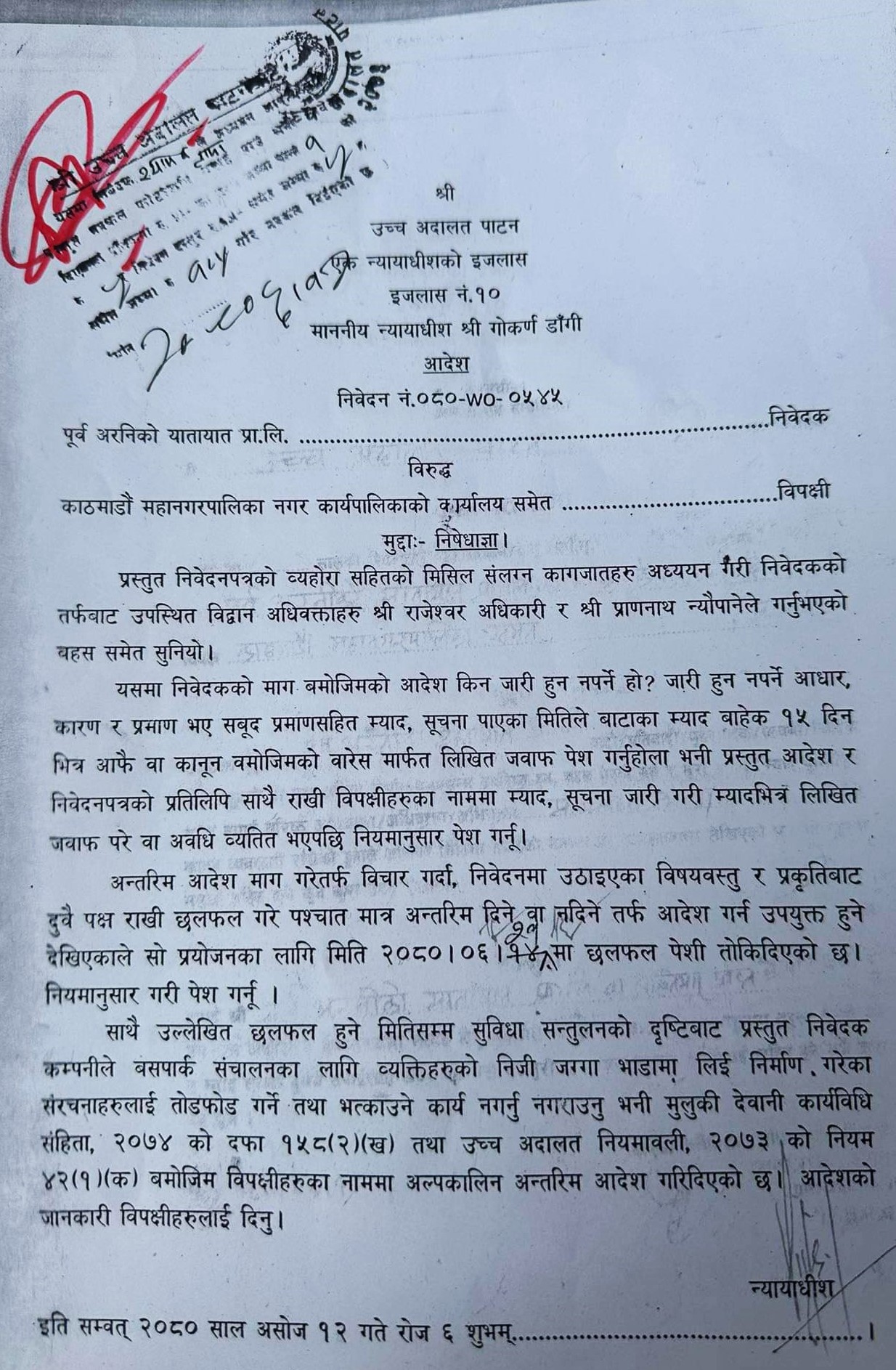 शुक्रबार न्यायाधीश गोकर्ण डाँगीको इजलासले बसपार्क नभत्काउन काठमाडौं महानगरपालिकालाई आदेश दिएको हो ।