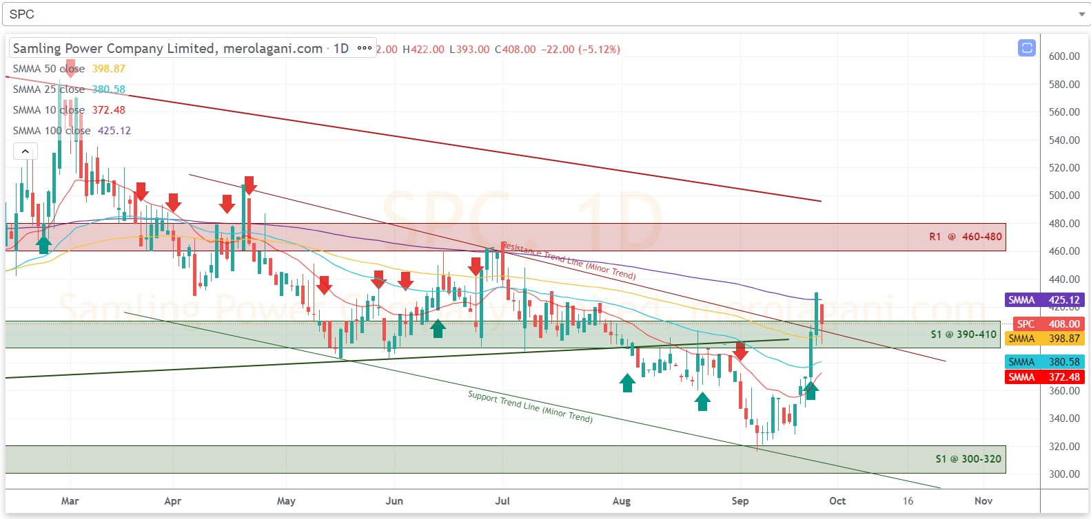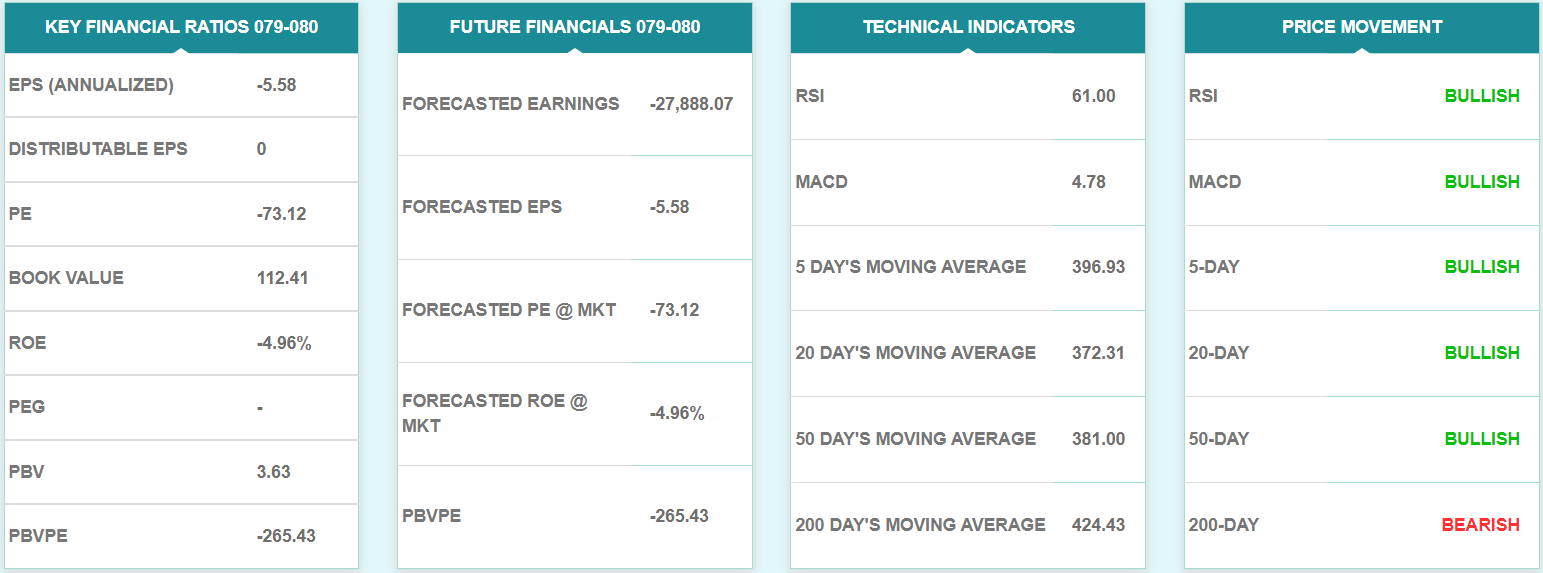 साताको अन्तिम कारोबार दिन कम्पनीको शेयरमूल्य टेवा क्षेत्रमा बन्द भएको छ। यस साता कम्पनीको शेयरमूल्यले गत साताको प्रतिरोध क्षेत्रलाई तोडेर माथि लागेको थियो। सोही अनुसार गत साताको प्रतिरोध क्षेत्र यस साताको लागि टेवा क्षेत्र बनेको हो। हाल कम्पनीको टेवा क्षेत्र ३९० देखि ४१० सम्म रहेको छ। त्यसैगरी कम्पनीको प्रतिरोध क्षेत्र ४६० देखि ४८० सम्म रहेको छ।
