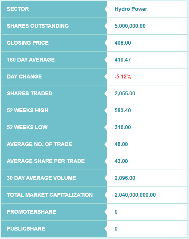 कम्पनीको पछिल्लो ५२ हप्ताको उच्च मूल्य ५८३ रुपैयाँ ४० पैसा रहेको छ भने न्यून मूल्य ३१६ रुपैयाँ रहेको छ। कम्पनीको १८० दिने औषत मूल्य ४१० रुपैयाँ ४७ पैसा रहेको छ।