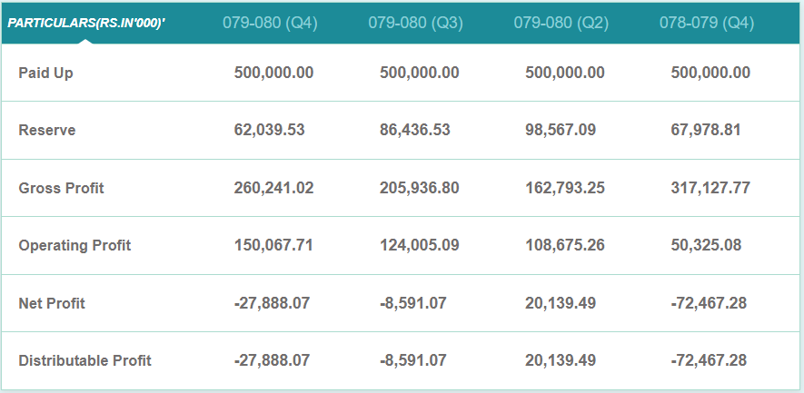 गत आर्थिक वर्षको असार मसान्तसम्ममा कम्पनीले २ करोड ७८ लाख रुपैयाँ खुद नोक्सानी व्यहोरेको छ। अघिल्लो आर्थिक वर्षको सोही अवधिसम्ममा कम्पनीको नोक्सानी ६ करोड २० लाख रुपैयाँ थियो। सो अवधिसम्ममा कम्पनीको वित्तीय खर्च १७ करोड ७९ लाख रुपैयाँ रहेको छ।