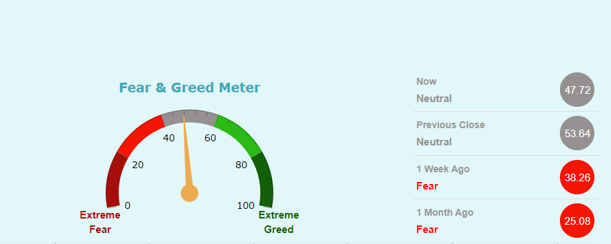 फियर एण्ड ग्रीड मिटरमा कम्पनी अहिले न्यूट्रल जोनमा रहेको छ। यसले लगानीकर्ताहरुमा कम्पनीको शेयरमूल्य बढ्ने लोभ र घट्ने डर दुबै धेरै नरहेको संकेत गर्दछ।