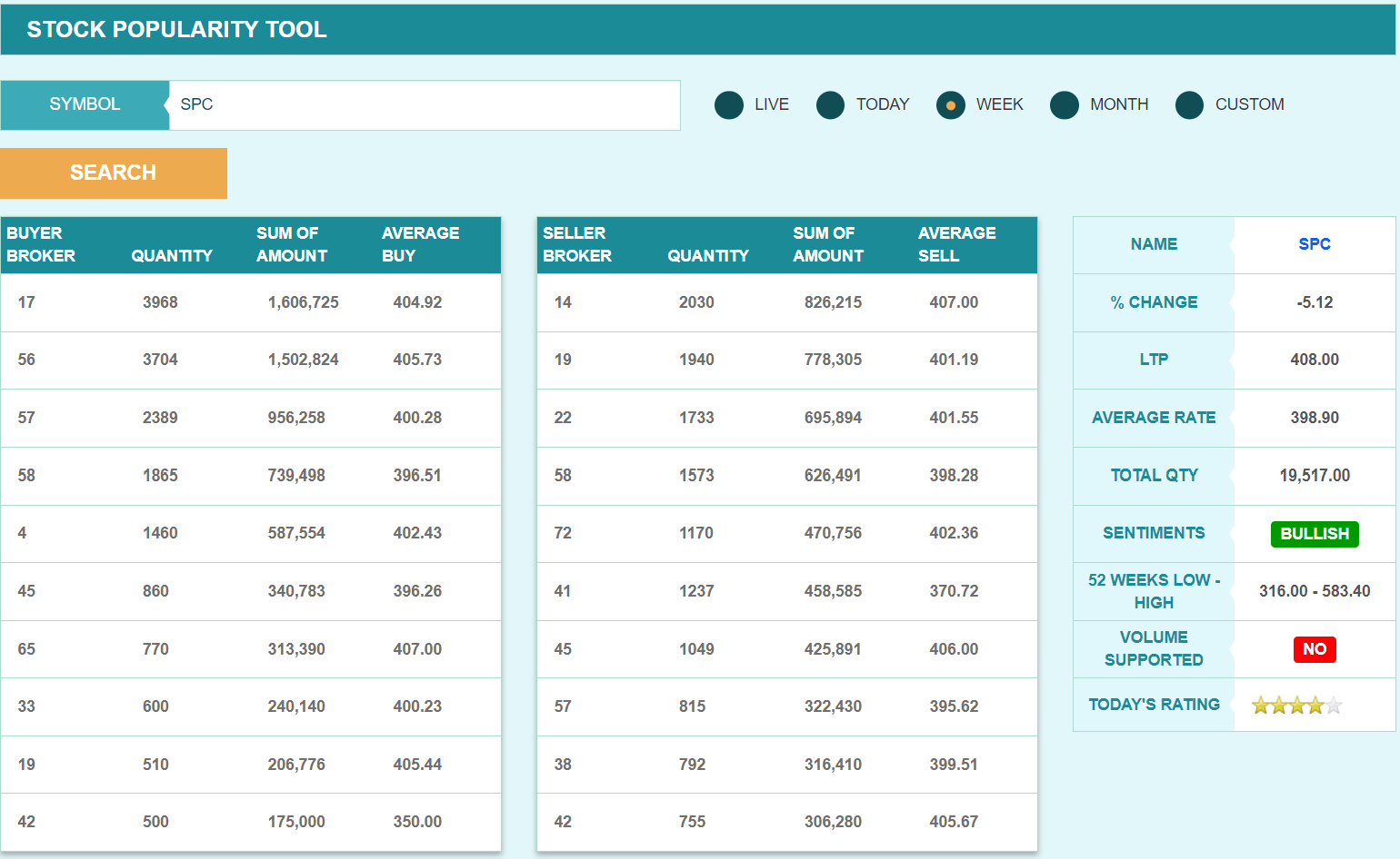 यस साता ब्रोकर नम्बर १७ ले कम्पनीको सबैभन्दा बढी शेयर खरिद गरेको छ भने सर्वाधिक बिक्री गर्नेमा ब्रोकर नम्बर १४ रहेको छ। १७ ले यस साता कम्पनीको ३ हजार ९६८ कित्ता शेयर खरिद गरेको छ। त्यस्तै, ब्रोकर नम्बर ५६ लाख ३ हजार ७०४ कित्ता शेयर खरिद गरेको छ भने ५७ ले २ हजार ३८९ कित्ता शेयर खरिद गरेको छ। यस साता ब्रोकर नम्बर १४ ले भने यस साता कम्पनीको २ हजार ३० कित्ता शेयर बिक्री गरेको छ।