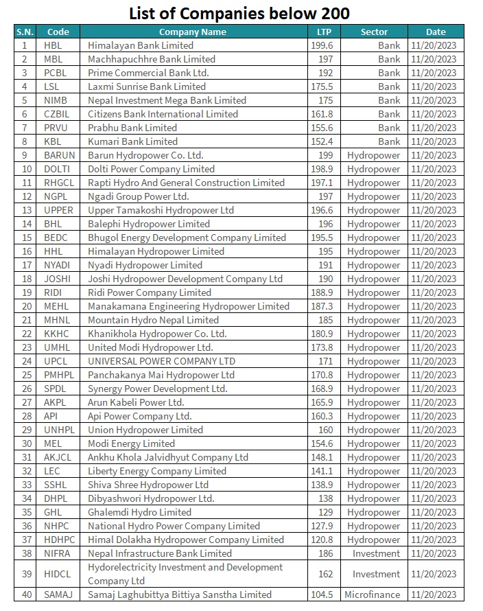 २ सय भन्दा कम मूल्यमा पाइने कम्पनीहरुमध्ये ८ वटा वाणिज्य बैंक समूहबाट, २९ वटा हाइड्रोपावर समूहबाट, २ वटा लगानी समूहबाट र १ वटा माइक्रोफाइनान्स समूहबाट परेका छन् ।