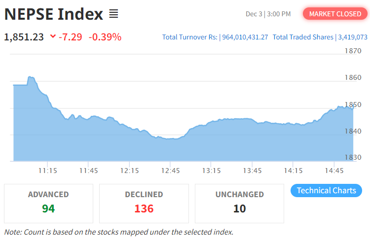 आइतबार नेप्से परिसूचक ७.२९ अंक घटेर १८५१.२३ विन्दुमा झरेको छ। त्यसैगरी, यस दिन सेन्सेटिभ इण्डेक्स १.६५ अंक घटेको छ भने फ्लोट इण्डेक्स ०.४९ अंक र सेन्सेटिभ फ्लोट इण्डेक्स ०.६० अंक घटेको छ।