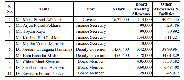 गभर्नर र डेपुटी गभर्नर बाहेक अन्य सञ्चालकले भने तलब पाउँदैनन। अन्य सञ्चालकले भने बैठक भत्ता र अन्य विशेष सुविधाबापत पैसा पाउछन्। गत वर्ष राष्ट्र बैंकका सञ्चालक चिन्तामणि शिवाकोटीले १५ लाख ६४ हजार रुपैयाँ र शंकरप्रसाद आचार्यले १० लाख ८ हजार रुपैयाँ भत्ता लिएका छन्।
