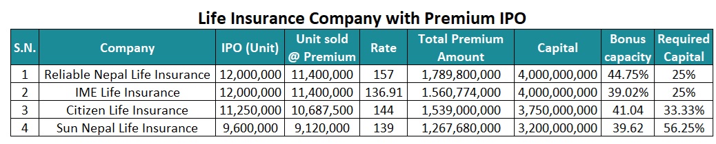 सिटिजन, रिलायबल नेपाल, आइएमई लाइफ र सन नेपाल लाइफ इन्स्योरेन्सले चुक्ता पुँजी बढाउन प्रिमियम रकमबाट बोनस सेयर नै जारी गर्नेछ । बाँकी रकम मात्रै हकप्रद निष्काशन गर्नुपर्ने हुन्छ । आइपीओमा संकलन गरेको प्रिमियम रकमबाट बोनस दिन पाएमा रिलायल नेपाल लाइफ इन्स्योरेन्स र आइएमई लाइफ इन्स्योरेन्सले सजिलै चुक्ता पुँजी ५ अर्ब पुर्याउन सकिने अवस्था छ । दुवै कम्पनीले डेढ अर्ब रुपैयाँभन्दा बढी रकम प्रिमियमबाट संकलन गरेका छन् । दुवै कम्पनीले अब १ अर्ब रुपैयाँ मात्रै पुँजी बढाए पुग्छ । सिटिजन लाइफले आइपीओबाट थोरै रकम संकलन गरेको भए पनि प्रिमियम रकम यथेष्ट हुँदा १ अर्ब २५ करोड चुक्ता पुँजी पुर्याउन हकप्रद शेयर जारी गर्नुपर्दैन ।