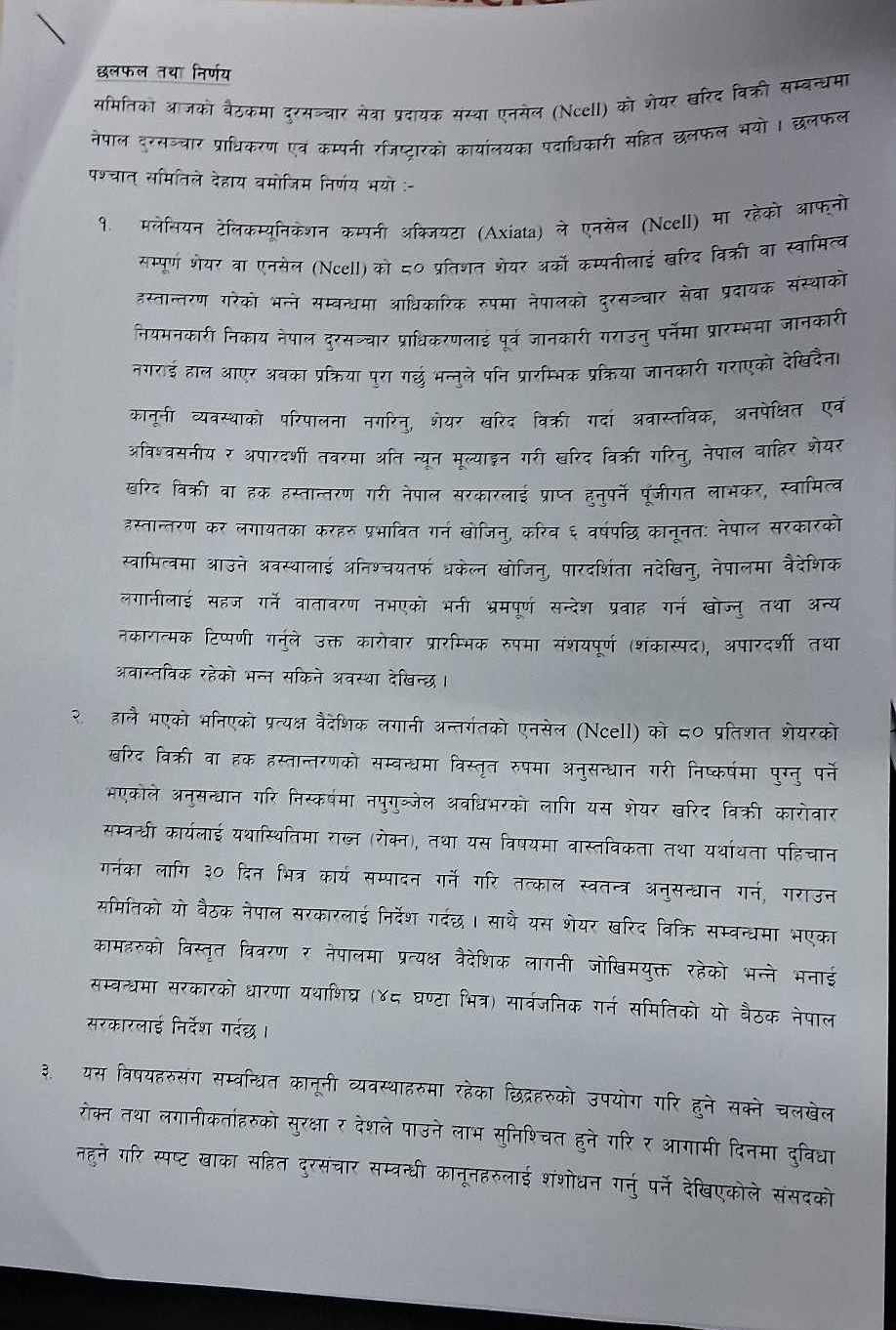 C5#त्यस्तै समितिले एनसेलको खरिदबिक्री बारे ३० दिनभित्र छानबिन गर्न पनि सरकारलाई निर्देशन दिएको छ । समितिले प्रधानमन्त्री पुष्पकमल दाहाल प्रचण्डलाई नै बोलाउने निर्णय पनि गरेको छ ।