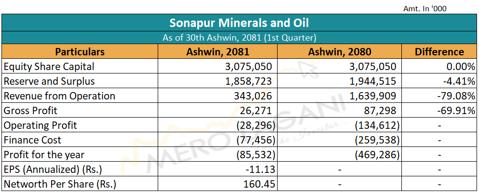 समीक्षा अवधिमा कम्पनीको सञ्चालन आम्दानी ७९.०८ प्रतिशत घटेको छ भने कुल नाफा ६९.९१ प्रतिशत घटेको छ। गत आर्थिक वर्षको पहिलो तीन महिनामा १३ करोड ४६ लाख रुपैयाँ ऋणात्मक रहेको कम्पनीको सञ्चालन मुनाफा चालु आर्थिक वर्षको सोही अवधिसम्मा २ करोड ८२ लाख रुपैयाँ ऋणात्मक रहेको छ। त्यस्तै, कम्पनीको वित्तीय खर्च २५ करोड ९५ लाख रुपैयाँबाट घटेर ७ करोड ७४ लाख रुपैयाँमा सीमित भएको छ। जसका कारण नोक्सानी घट्न पुगेको हो।