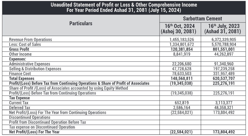 असोज मसान्तसम्ममा कम्पनीले १ अर्ब ४५ करोड ५१ लाख रुपैयाँ सञ्चालन आम्दानी गरेको छ। त्यस्तै, सो अवधिसम्ममा कम्पनीको कुल नाफा १२ करोड ३ लाख रुपैयाँ रहेको छ भने अन्य आम्दानी ८८ लाख ४१ हजार रुपैयाँ रहेको छ। सो अवधिसम्ममा कम्पनीको कुल खर्च १४ करोड ८५ लाख रुपैयाँ रहेको छ।