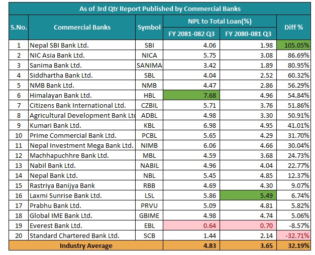 चालु आवको तेस्रो त्रैमाससम्ममा ९ वटा बैंकको खराब कर्जा अनुपात ५ प्रतिशतभन्दा बढी देखिएको छ। सिभिल बैंकलाई आफूमा गाभेर कारोबार गरेको हिमालयन बैंकको सबैभन्दा बढी खराब कर्जा देखिएको छ । हिमालयन बैंकको खराब कर्जा ७.६८ प्रतिशत रहेको छ भने त्यसलाई क्रमशः कुमारी बैंक र नेपाल इन्भेष्टमेन्ट मेगा बैंकले पछ्याएको छ । कुमारी बैंकको खराब कर्जा ६.९८ प्रतिशत र नेपाल इन्भेष्टमेन्ट मेगा बैंकको खराब कर्जा ६.०६ प्रतिशत रहेको छ । त्यस्तै लक्ष्मी सनराइज बैंक, सिटिजन्स बैंक इन्टरनेसनल, प्राइम कमर्सियल बैंक, नेपाल बैंक र प्रभु बैंकको खराब कर्जा राष्ट्र बैंकले तोकेको ५ प्रतिशतको सीमा भन्दा माथि देखिएको छ ।