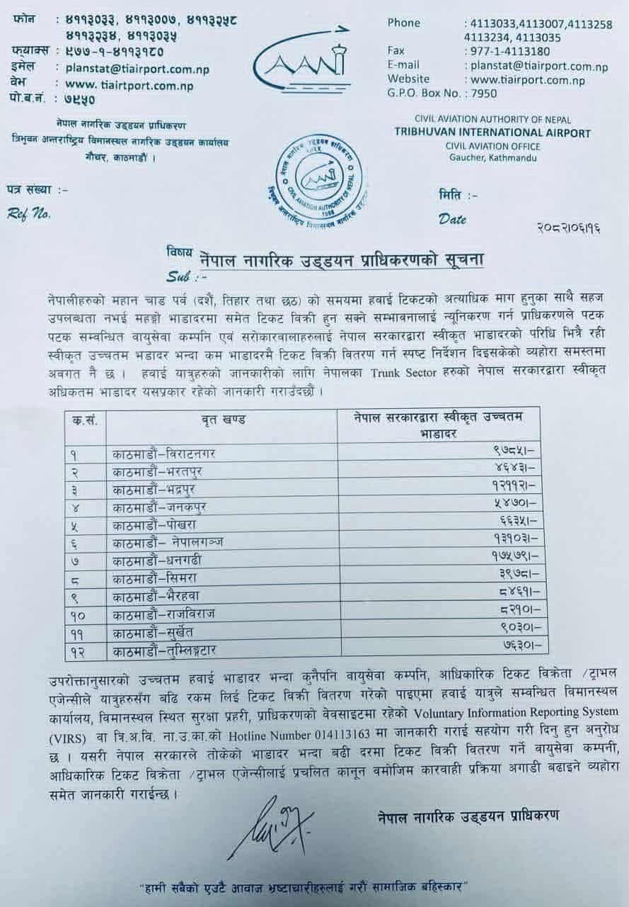 हुन त घटस्थापनापछि हवाइ कम्पनीले आफुखुसी हवाइ टिकट बेच्दै आएका थिए । चाडबाडमा हवाइ टिकटको अत्यधिक माग हुने तर सहज उपलव्ध नहुँदा महंगो भाडादरमा समेत टिकट बिक्रि हुने सम्भावना न्यूनीकरण गर्न भन्दै क्यानले अधिकतम भाडादर स्वीकृत गरेको जनाएको छ ।