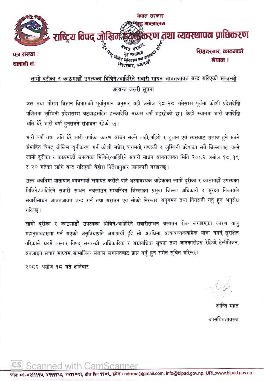 शनिबार राष्ट्रिय विपद जोखिम न्यूनीकरण तथा व्यवस्थापन प्राधिकरणले सुचना जारी गर्दै विभिन्न ठाउँमा भारी वर्षा तथा अति भारी वर्षाका कारण आउन सक्ने बाढी, पहिरो र डुवान एवं त्यसबाट उत्पन्न हुन सक्ने सम्भावित परिस्थितिको आकंलन गर्दै कोशी, मधेस, बागमति, गण्डकी र लुम्बिनी प्रदेशका सवै जिल्लाबाट चल्ने लामो दूरीका सवारी सञ्चालनमा रोक लगाउन निर्देशन दिएको छ ।