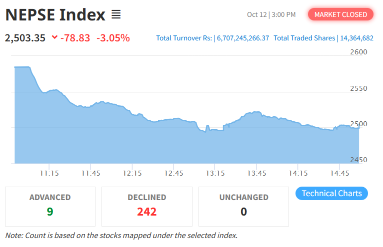 आइतबार नेप्से परिसूचक ७८.८३ अंक घटेर २५०३.३५ विन्दुमा झरेको छ। त्यस्तै, यस दिन सेन्सेटिभ इण्डेक्स ११.९१ अंक घटेको छ भने फ्लोट इण्डेक्स ५.२३ अंक र सेन्सेटिभ फ्लोट इण्डक्स ४.३२ अंक घटेको छ।