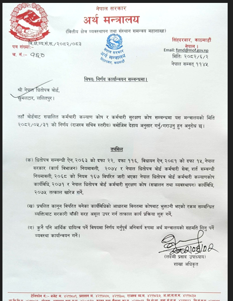 माथि उल्लेखित तस्बिर अर्थ मन्त्रालयले गएको असोज २ गते धितोपत्र बोर्डलाई पठाएको निर्देशन हो। अर्थ मन्त्रालयका तत्कालीन राजस्व सचिव स्तरीय बैठकले गरेको उक्त निर्णयको पत्र धितोपत्र बोर्डले असोज ३ गते पाएको थियो।