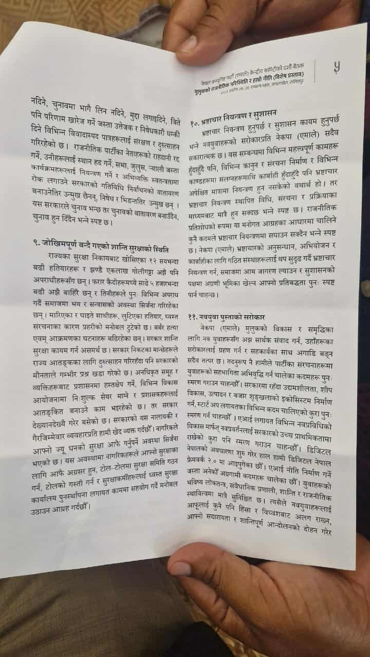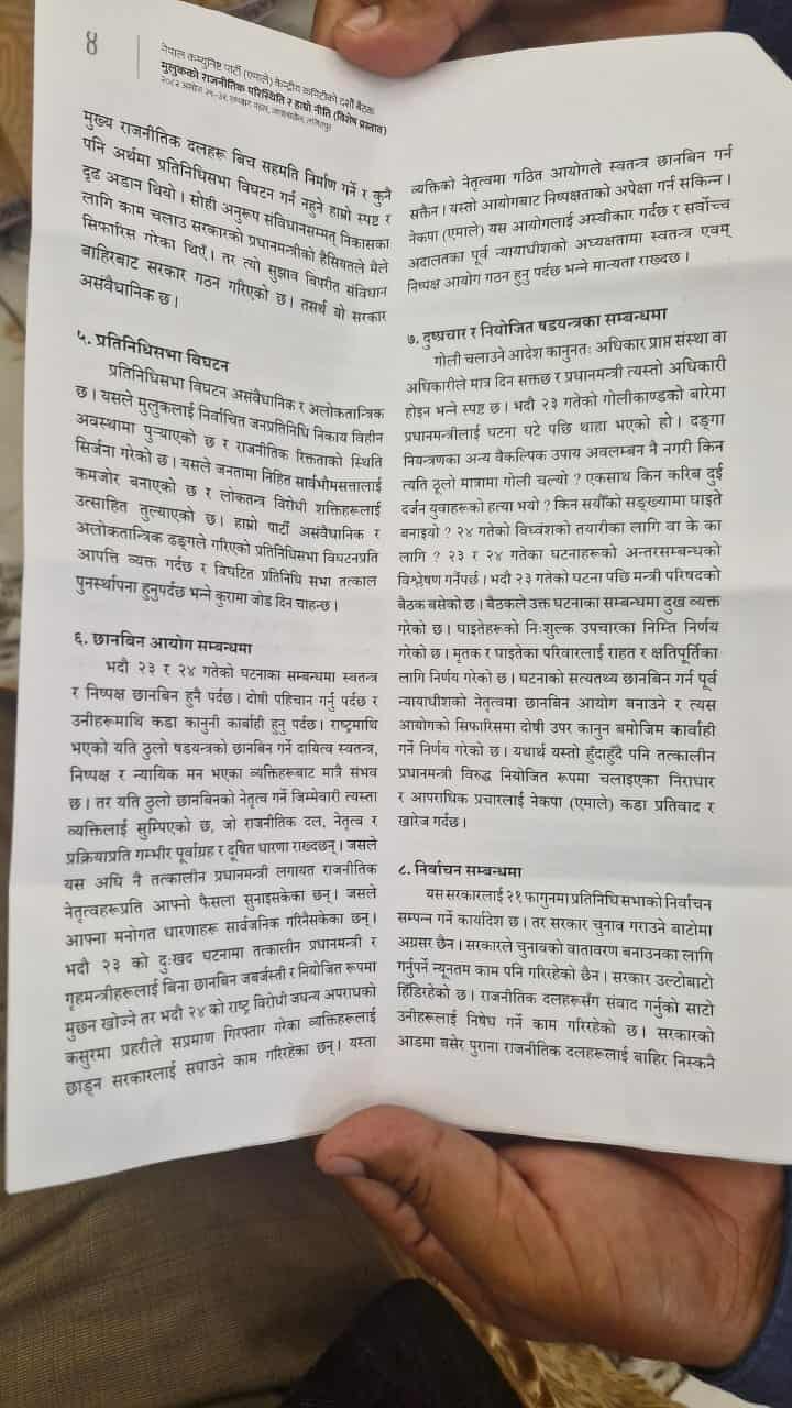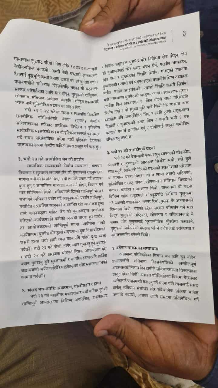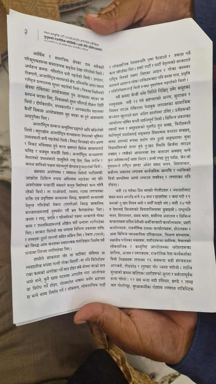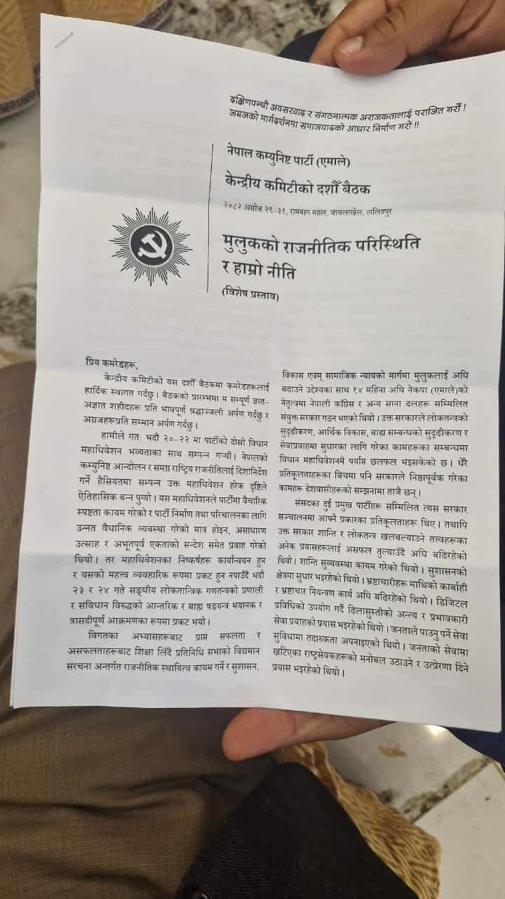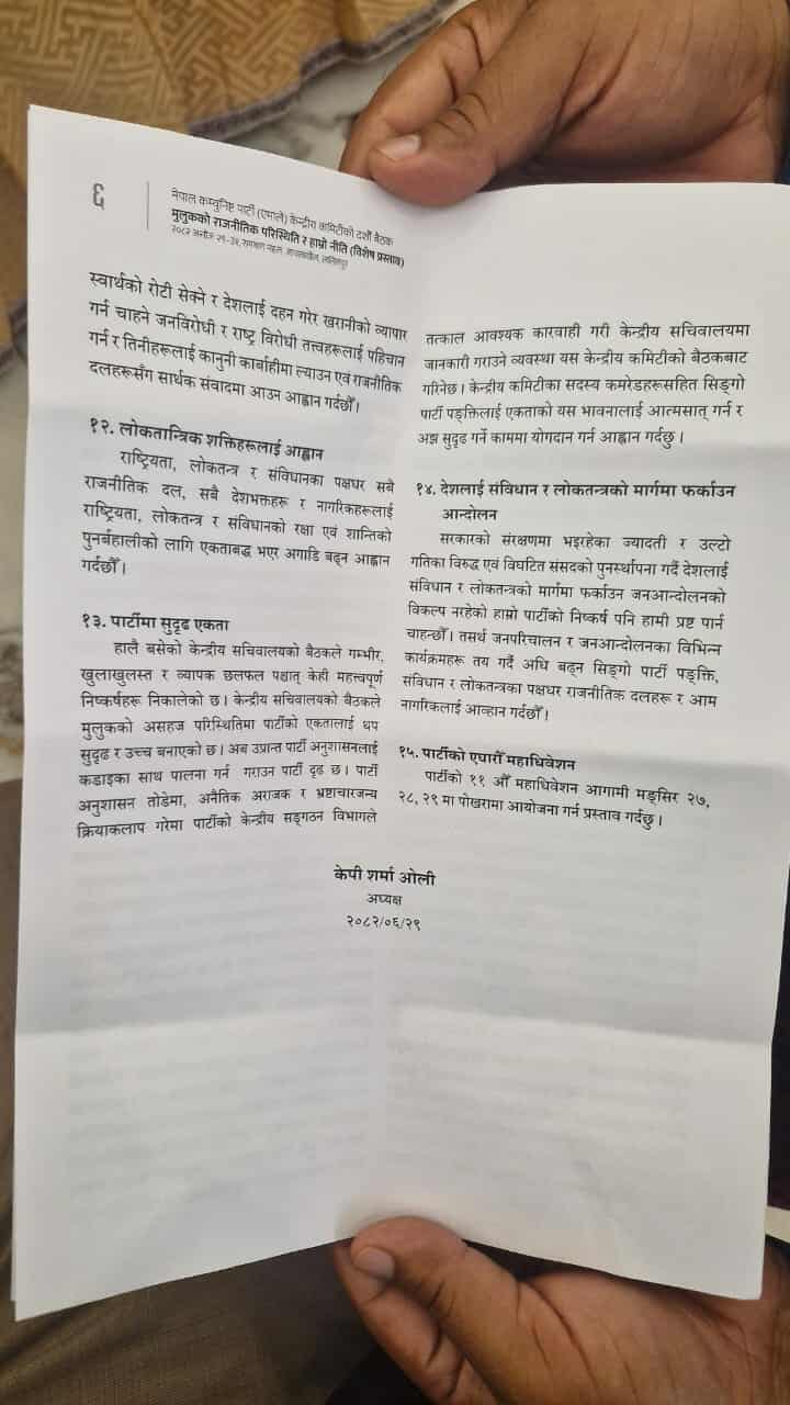 बुधबार ललितपुरको जावलाखेलमा जारी बैठकमा अध्यक्ष ओलीले विभिन्न विषय समेटेर विशेष प्रस्ताव राखेका हुन् । उनले विभिन्न आयाेजनामा निः शुल्क शेयर माग्ने काम भइरहेकाे 'मुलुककाे राजनीतिक परिस्थिति र हाम्राे नीति' विशेष प्रस्तावमा उल्लेख गरेका छन् ।