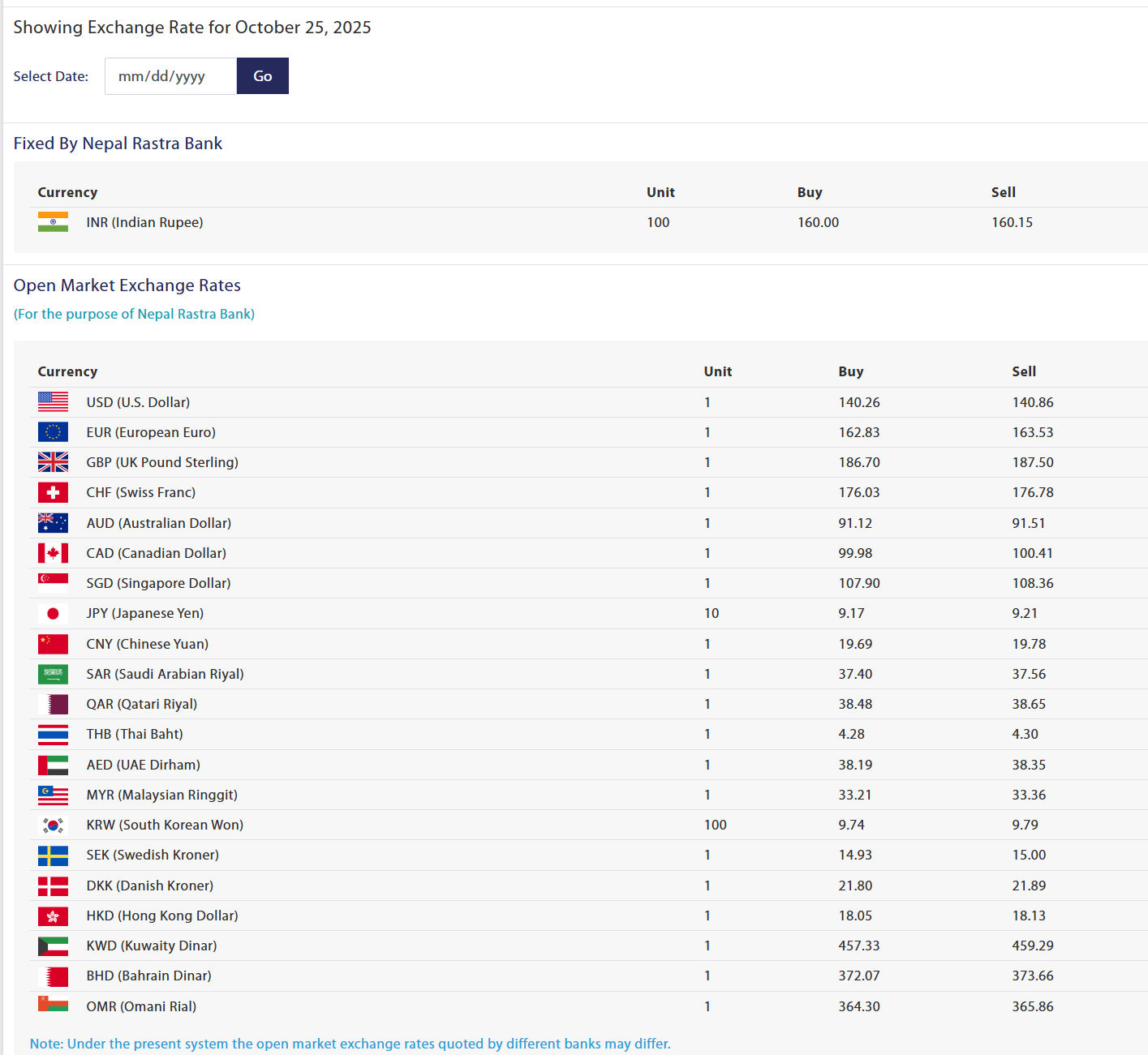 युरोपियन युरो एकको खरिदर १६२ रूपैयाँ ८३ पैसा र बिक्रीदर १६३ रूपैयाँ ५३ पैसा, युके पाउन्ड स्टर्लिङ एकको खरिददर १८६ रूपैयाँ ७० पैसा र बिक्रीदर १८७ रूपैयाँ ५० पैसा, स्विस फ्र्याङ्क एकको खरिददर १७६ रूपैयाँ ३ पैसा र बिक्रीदर १७६ रूपैयाँ ७८ पैसा कायम गरिएको छ।