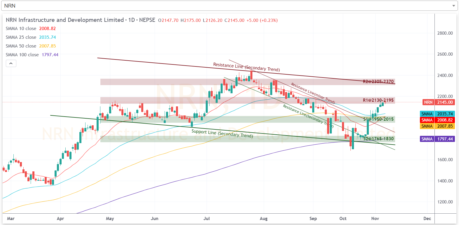 साताको अन्तिम कारोबार दिन कम्पनीको शेयरमूल्य प्रतिरोध क्षेत्रमा रहेको छ। हाल कम्पनीको प्रतिरोध क्षेत्र २ हजार १३० देखि २ हजार १९५ सम्म रहेको छ। नेप्सेले आगामी दिनमा सो प्रतिरोध क्षेत्र तोडेर उकालो लागेमा २ हजार ३०५ देखि २ हजार ३७० को क्षेत्रमा प्रतिरोधको सामना गर्ने देखिन्छ। तर, सो क्षेत्रमा प्रतिरोधको सामना गरी तल झरेमा भने १ हजार ९५० देखि २ हजार १५ को क्षेत्रमा टेवा पाउने देखिन्छ।