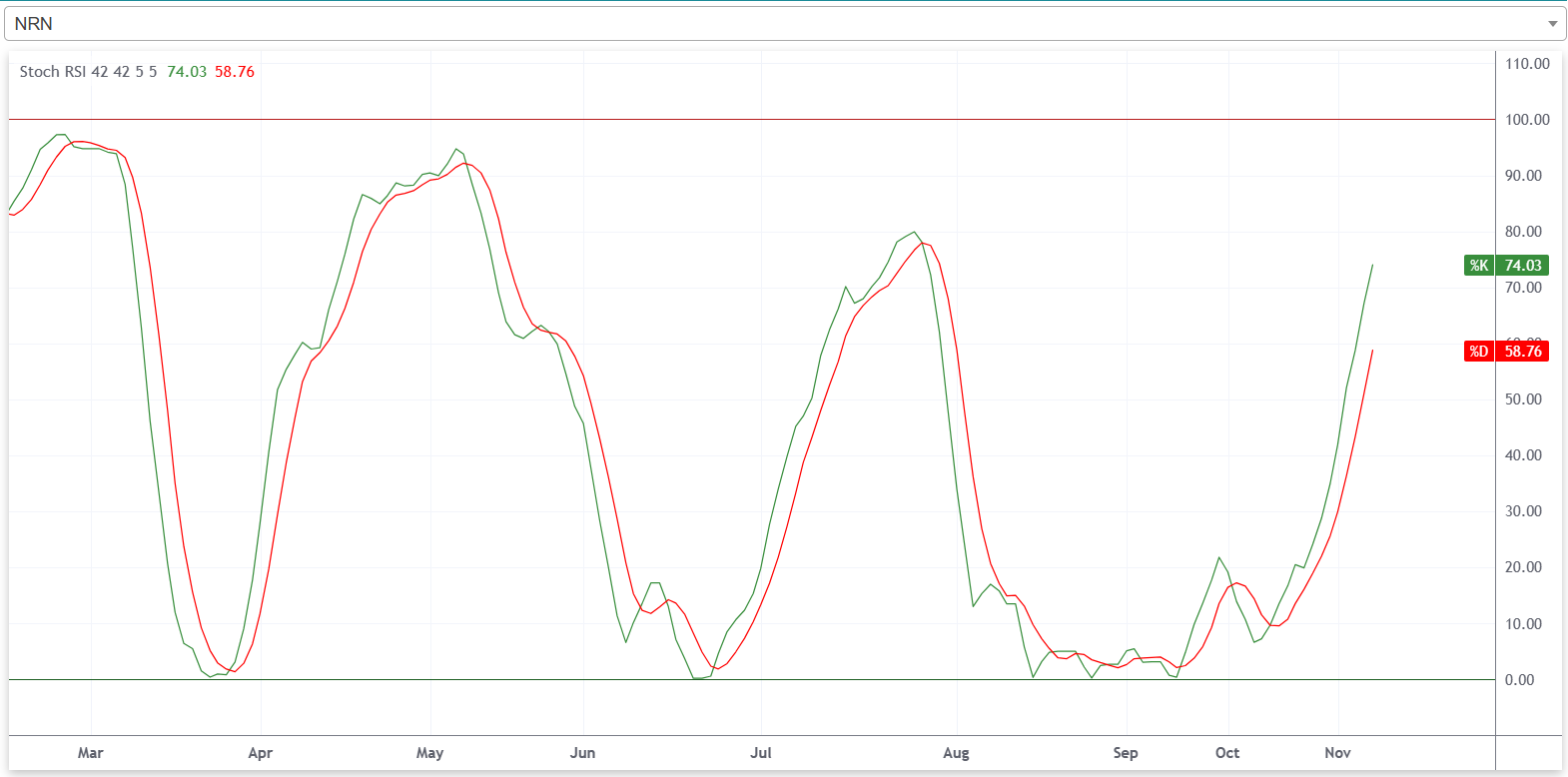 साताको अन्तिम कारोबार दिन स्टकास्टिक आरएसआईमा कम्पनीको शेयरमूल्य न्यूट्रल जोनबाट ओभरबट जोनतर्फ पुगेको छ। यसले सो साता कम्पनीको शेयरमा खरिदचाप बढ्न थालेको संकेत गर्दछ।