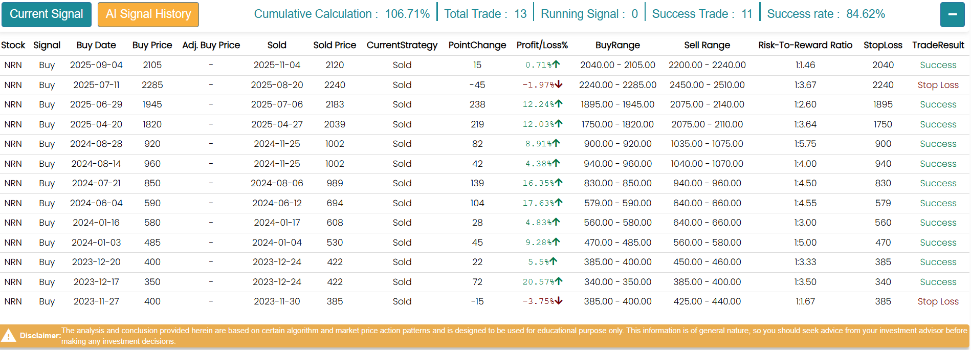 मेरो लगानी एआईले हालसम्म कम्पनीको शेयरमा कुल १३ पटक बाइ सिग्नल दिइसकेको छ। जसमध्ये १३ सिग्नलमा लगानीकर्ताहरुले नाफा कमाएका थिए भने २ सिग्नलमा स्टप लस गर्नु परेको थियो। हाल मेरोलगानी एआईले कम्पनीको शेयरमा कुनै सिग्नल दिएको छैन।