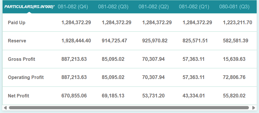 गत आर्थिक वर्षको अन्त्यसम्ममा कम्पनीले ६७ करोड ८ लाख रुपैयाँ खुद नाफा कमाएको छ। यो अघिल्लो आर्थिक वर्षको सोही अवधिको तुलनामा १० गुणा अर्थात ८८९.०४ प्रतिशत बढी हो। अघिल्लो आर्थिक वर्षको सोही अवधिसम्ममा कम्पनीले ६ करोड ७८ लाख रुपैयाँ खुद नाफा कमाएको थियो।