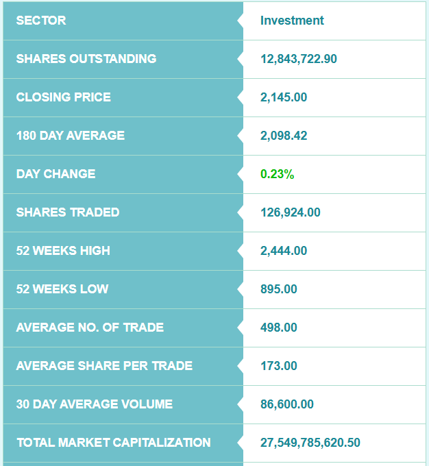 हाल नेप्सेमा कम्पनीको १ करोड २८ लाख ४३ हजार ७२२.९० कित्ता शेयर सूचीकृत छन्। कम्पनीको १८० दिने औषत मूल्य २ हजार १४५ रुपैयाँ रहेको छ। त्यसैगरी, कम्पनीको ५२ हप्ताको उच्च मूल्य २ हजार ४४४ रुपैयाँ रहेको छ भने न्यून मूल्य ८९५ रुपैयाँ रहेको छ। साताको अन्तिम कारोबार मूल्य अनुसार कम्पनीको कुल बजार पूँजीकरण २७ अर्ब ५४ करोड ९७ लाख ८५ हजार ६२० रुपैयाँ ५० पैसा रहेको छ।