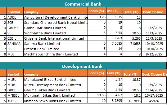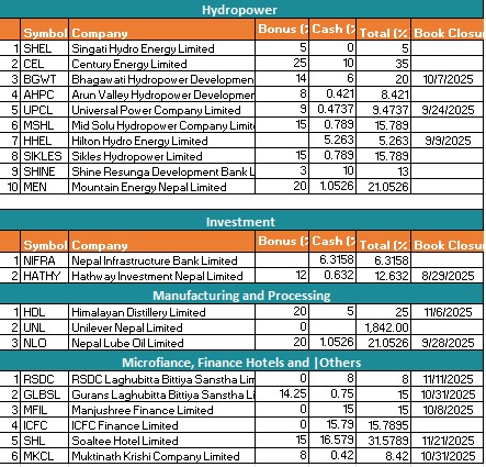 दोस्रो बजारमा सूचीकृत भएका ३४ वटा कम्पनीले मात्रै गत आर्थिक वर्षको मुनाफाबाट लाभांश वितरणको घोषणा गरेका छन् । जस मध्येमा ८ वाणिज्य बैक, १० वटा हाइड्रोपावर, ५ विकास बैंक रहेका छन् । त्यसैगरी लगानी समूहका नेपाल इन्फ्रास्टक्चर बैंक, हाथवेय इन्भेष्टमेन्ट कम्पनीले लाभांश वितरण गरिसकेका छन् । उत्पादन तथा प्रशोधन समूहका हिमालयन डिस्ट्रिलरी, यूनिलिभर नेपाल र नेपाल ल्यूबको प्रतिफल वितरण भइसकेको छ । आरएसडीसी लघुवित्त, गुँरास लघुवित्त मञ्जुश्री फाइनान्स, आइसीएफसी फाईनान्स, सोल्टी होटल र मुक्तिनाथ कृषि कम्पनीले गत वर्षको मुनाफाबाट लाभांश वितरण गरेका हुन् ।